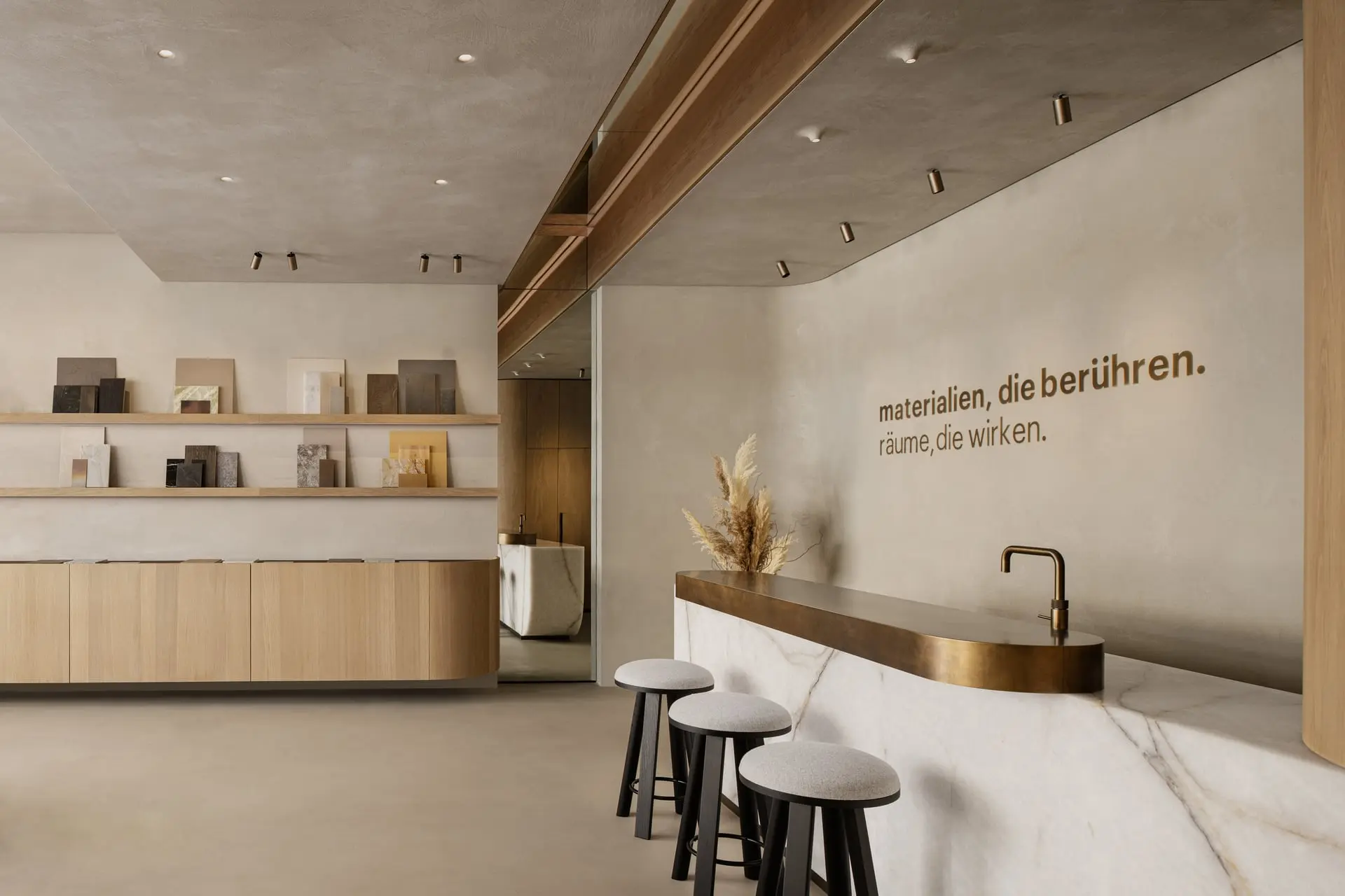 The premise of destilat's design was to deliberately curate the material possibilities of the TDW material labs. To add more tension to the space, supposed skylights were constructed using mirrored ceiling cut-outs. The central element is the natural stone counter with a brushed metal surface, which runs across the room, intersects different zones, and cleverly conceals both the back office and the bar. A sense of restraint is evident in the homogeneous design of the walls and floor, creating a coherent architectural framework that can be reinterpreted again and again.