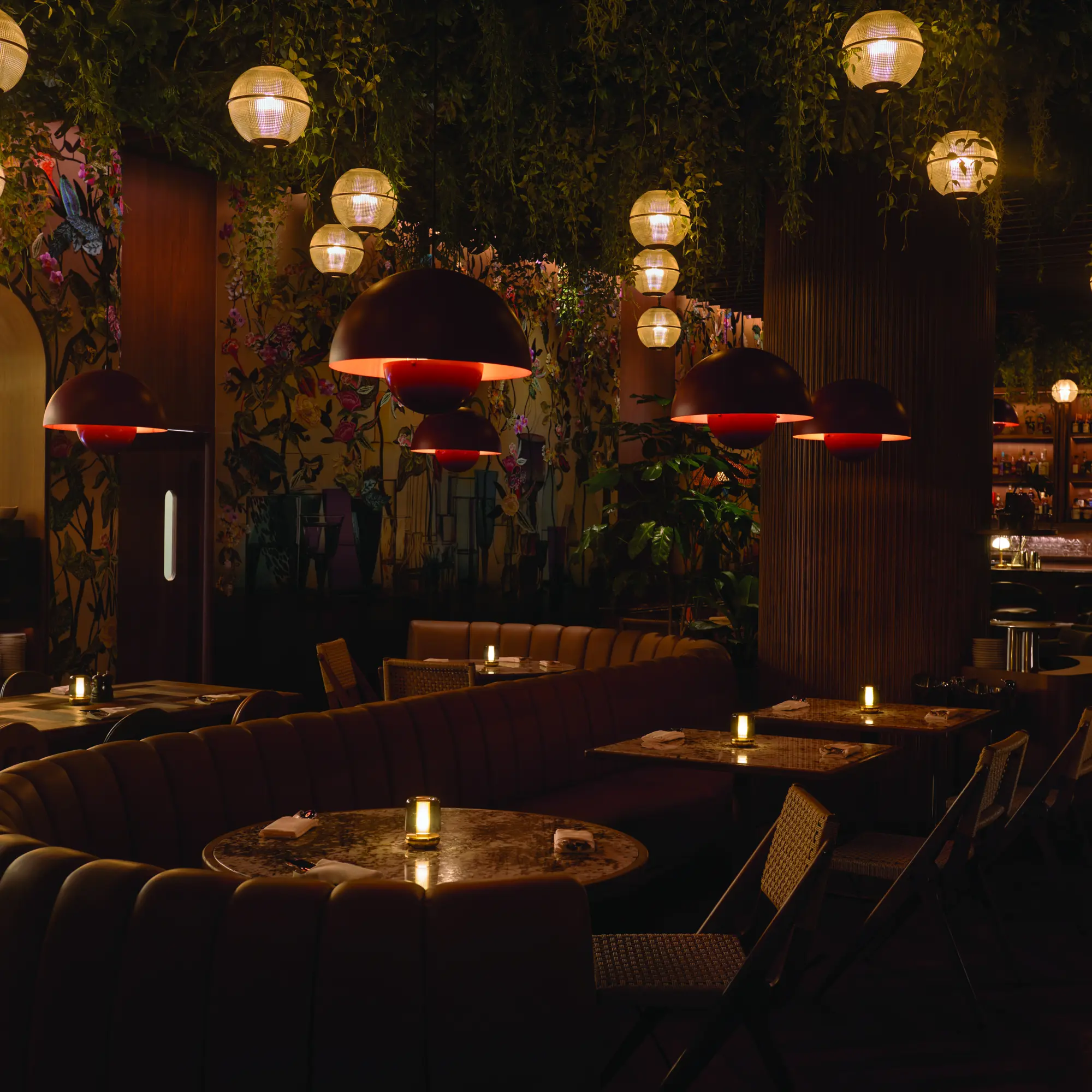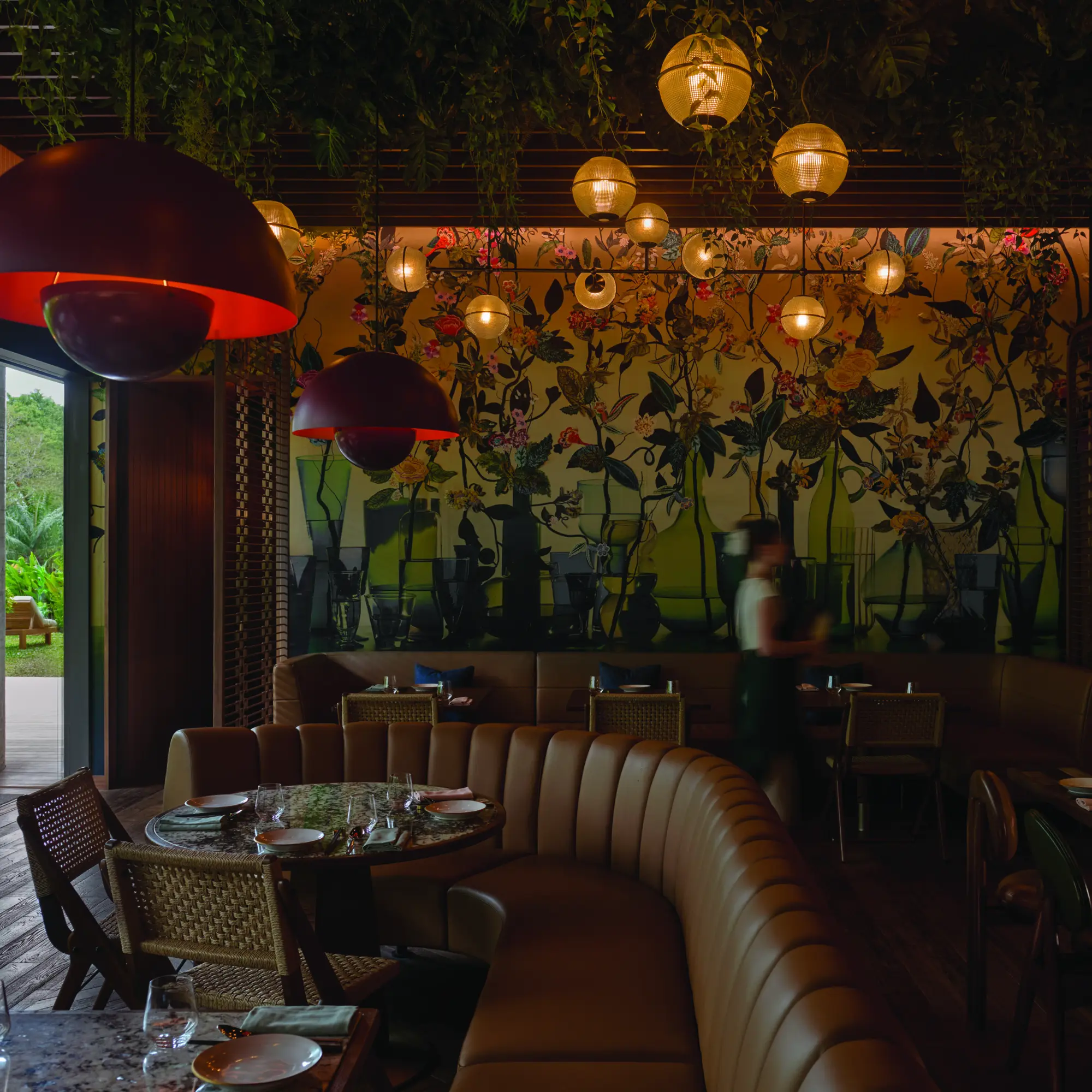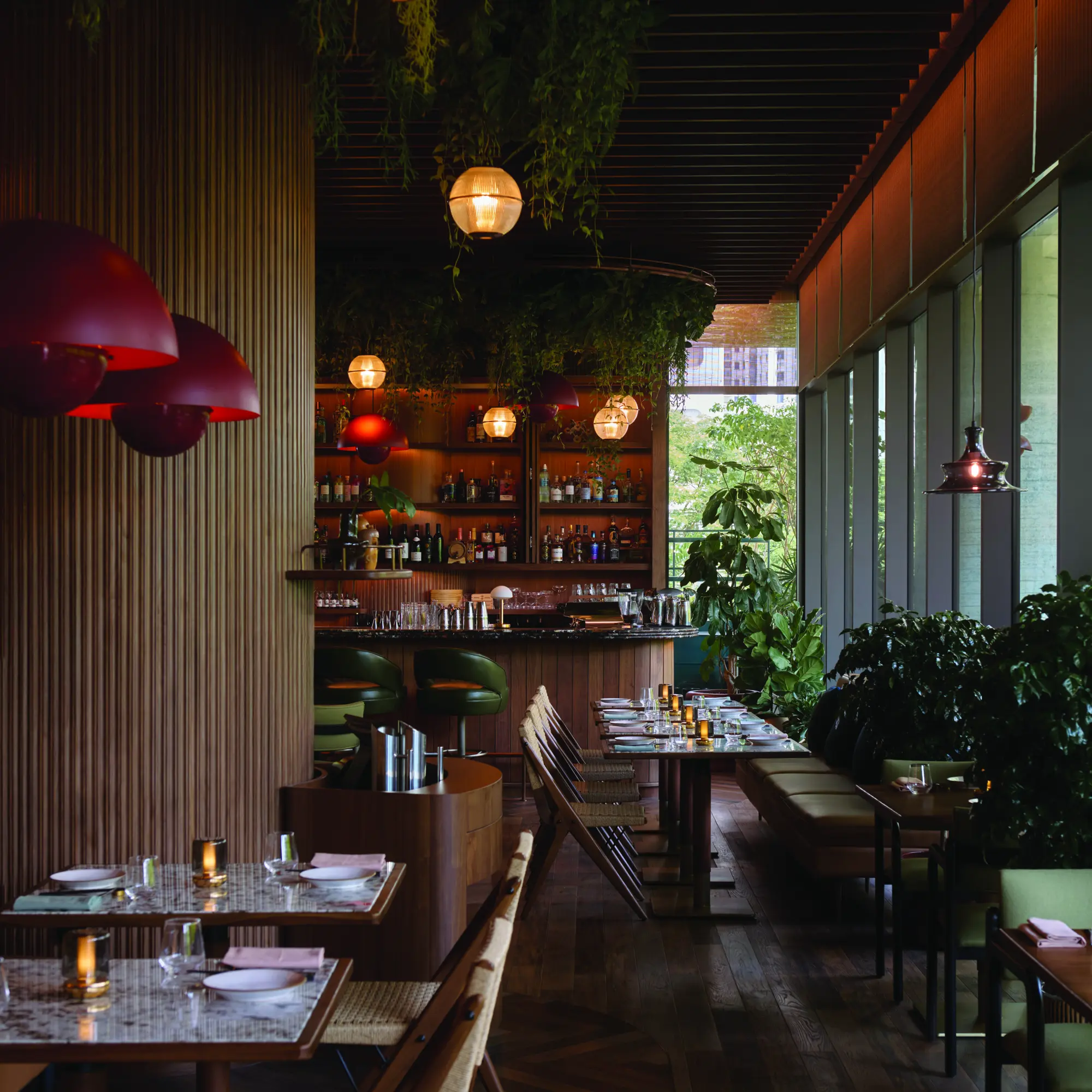 The Standard is famed for its irreverent & immersive take on hospitality. In Singapore, lush greenery inside-and-out pays homage to SG as a “City-in-a-Garden”, celebrating tropicality in the Reception’s oversized terrarium counter, Kaya Restaurant’s botanical mural with 3D tapestry & brocade, and Kaya’s dramatic ceiling scape of hanging greenery. Kaya transforms from day to night, through multiple light settings & curated playlists. Our interiors play up the hotel’s love for mid-century modern, intensifying it through carefully crafted custom furniture & lighting. The Standard’s signature red is playfully showcased in the atmospheric lift.