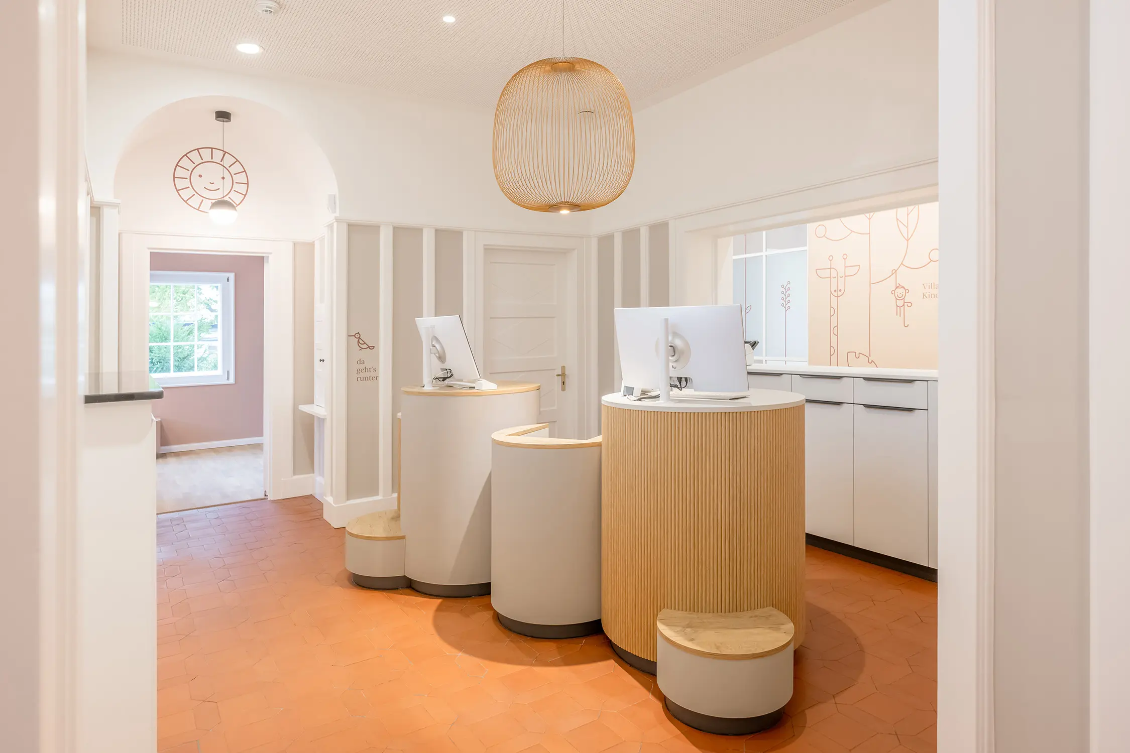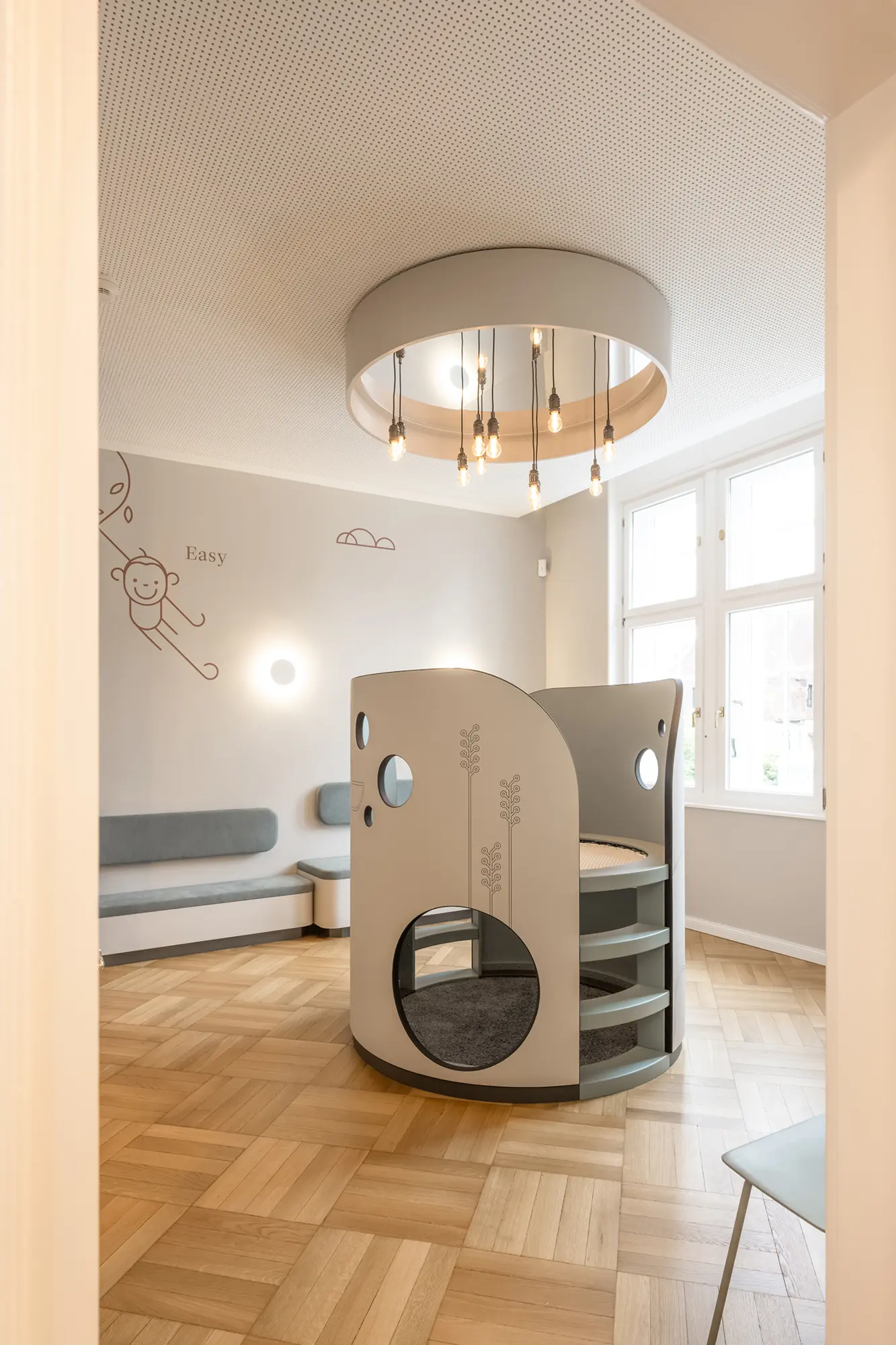 Old Walls, New Ideas! A pediatric dental practice in a heritage building from 1910 – what may at first seem contradictory turned out to offer not only challenges, but also tremendous design opportunities thanks to the historic fabric. The result is an atmosphere that offers children and parents a truly unique experience, impossible to replicate elsewhere. Inspired by the Genius Loci, old and new elements blend together in remarkable harmony. High, light-filled rooms create a spacious and distinctive spatial experience.