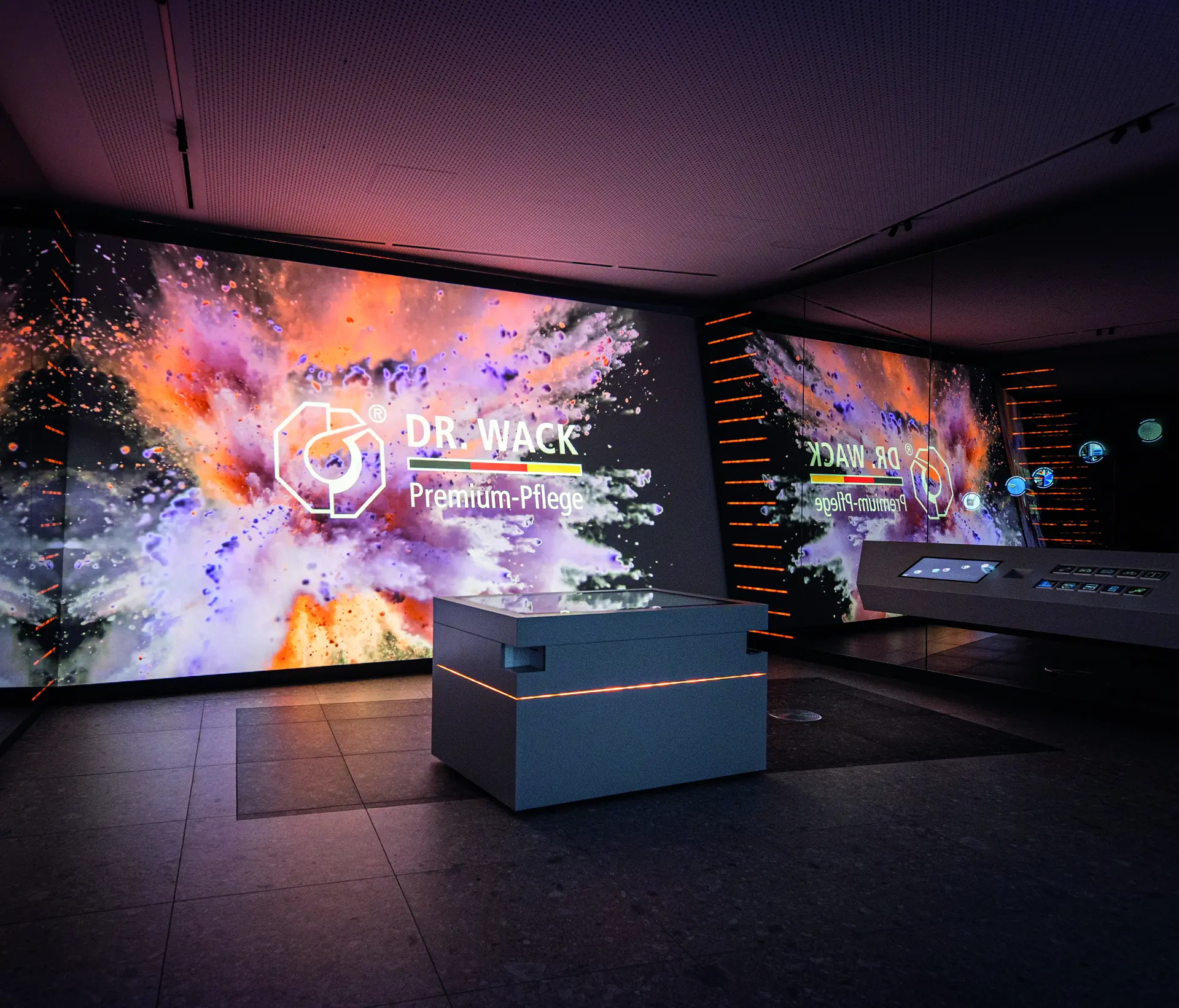 506 / 5.000. The Wack Group, based near Ingolstadt, has been synonymous with premium car care for over 50 years. The Zestron division has been successfully operating in the field of chemical precision cleaning for over 30 years and is now the world's leading supplier of cleaning agents and technologies for electronics manufacturing. Garamantis Interactive Technologies from Berlin was entrusted with the conception, planning, and implementation of a unique digital showroom in the new headquarters building in Germany.