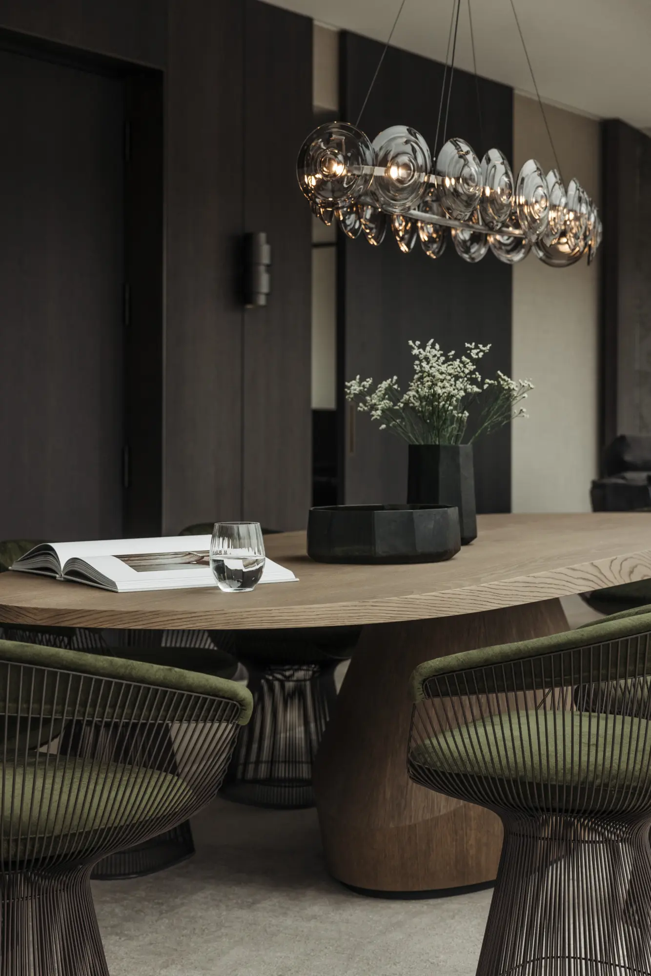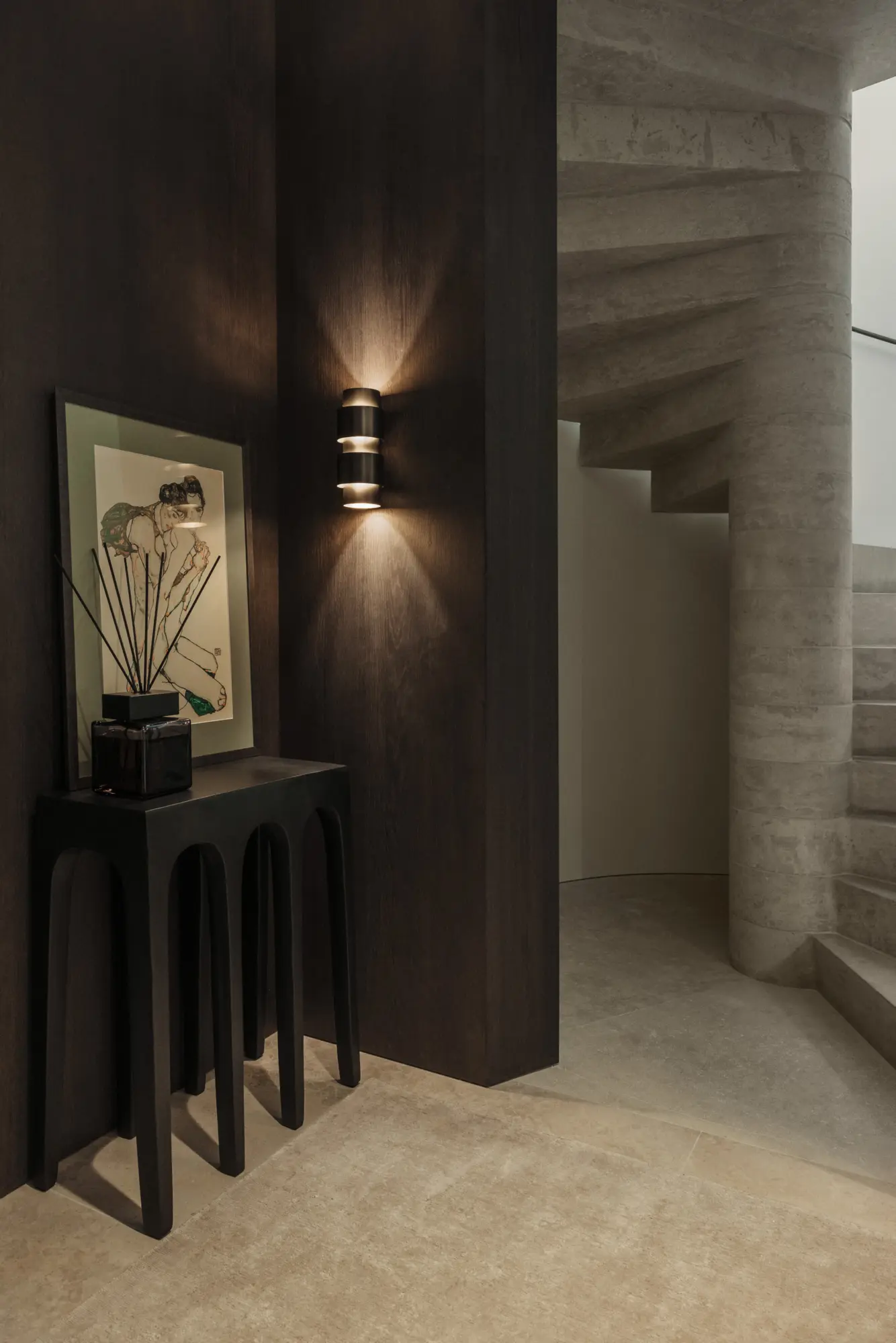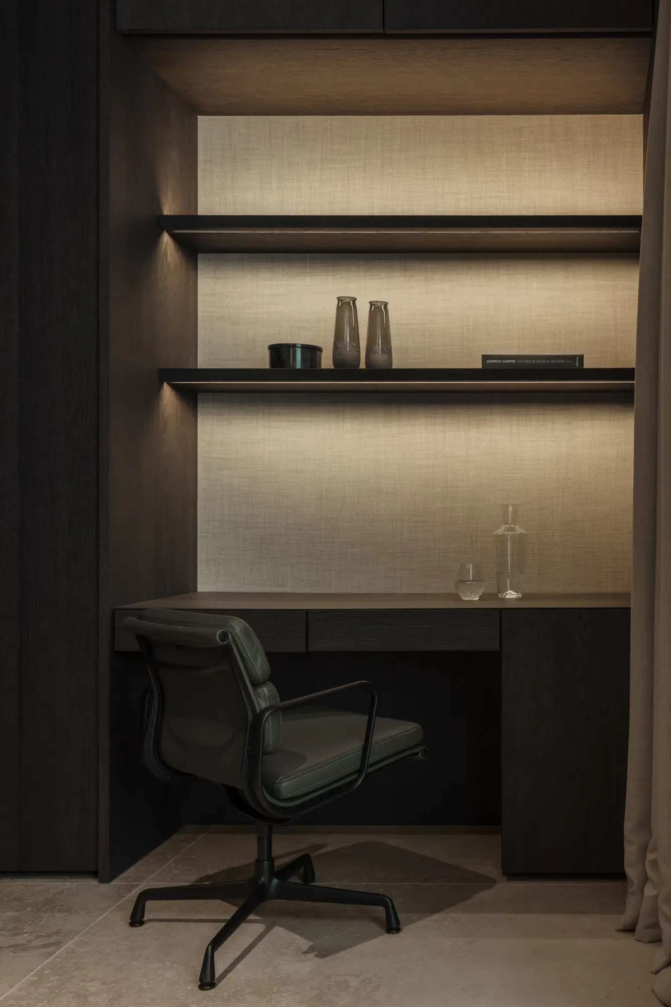 This 224 sqm penthouse in a Sir David Chipperfield-designed villa in Munich’s Herzogpark showcases bespoke interior design. Oak, travertine, leather, and fabric panels create a calm, natural ambiance. Spanning two levels, connected by a natural stone staircase, the space is bathed in light through floor-to-ceiling glazing. Design pieces by Baxter, Ochre, CTO Lighting, and Knoll International add refined touches. Every element—from custom joinery to atmospheric lighting—was executed with precision, resulting in a timeless, elegant interior defined by craftsmanship and material harmony.