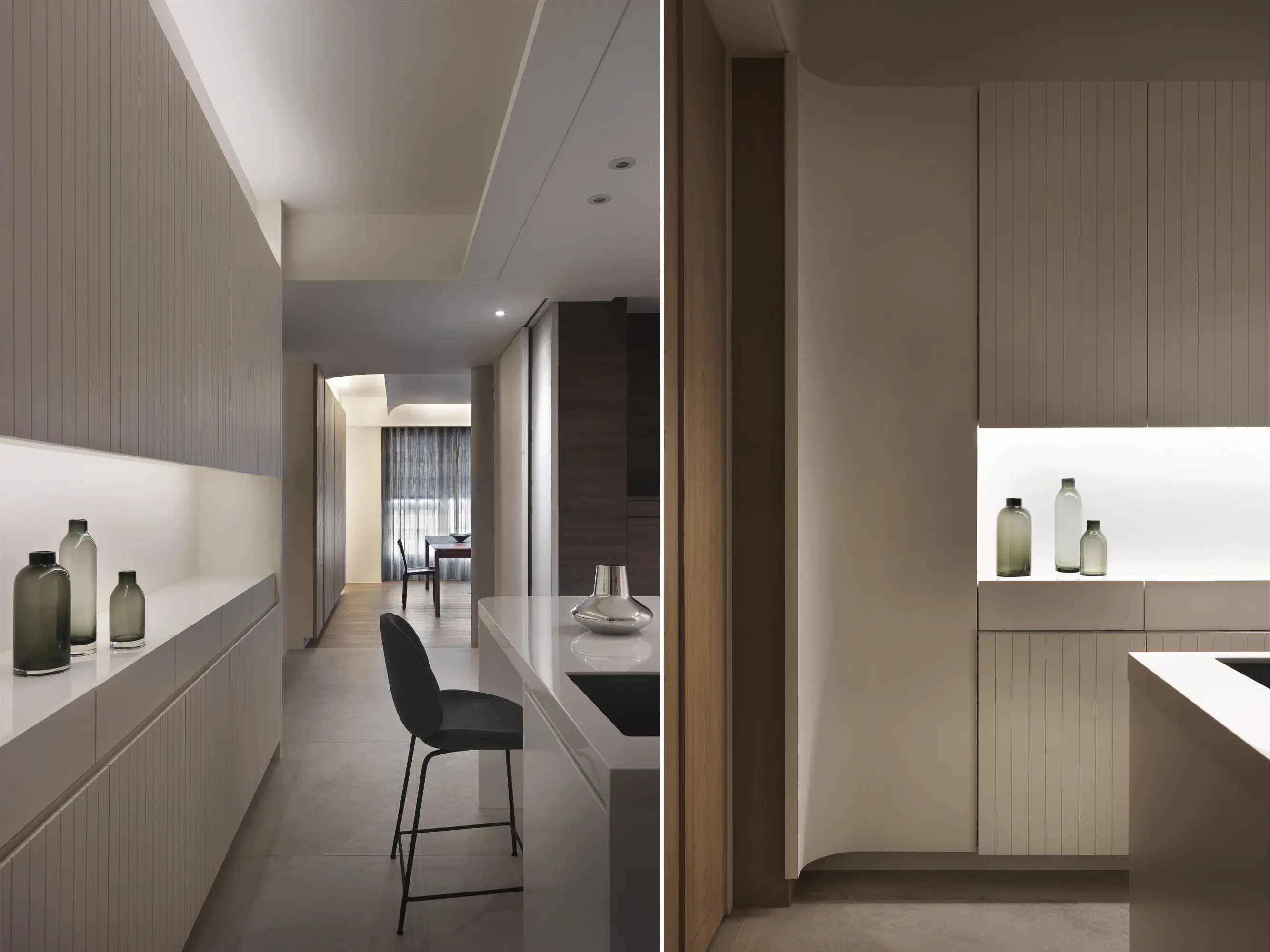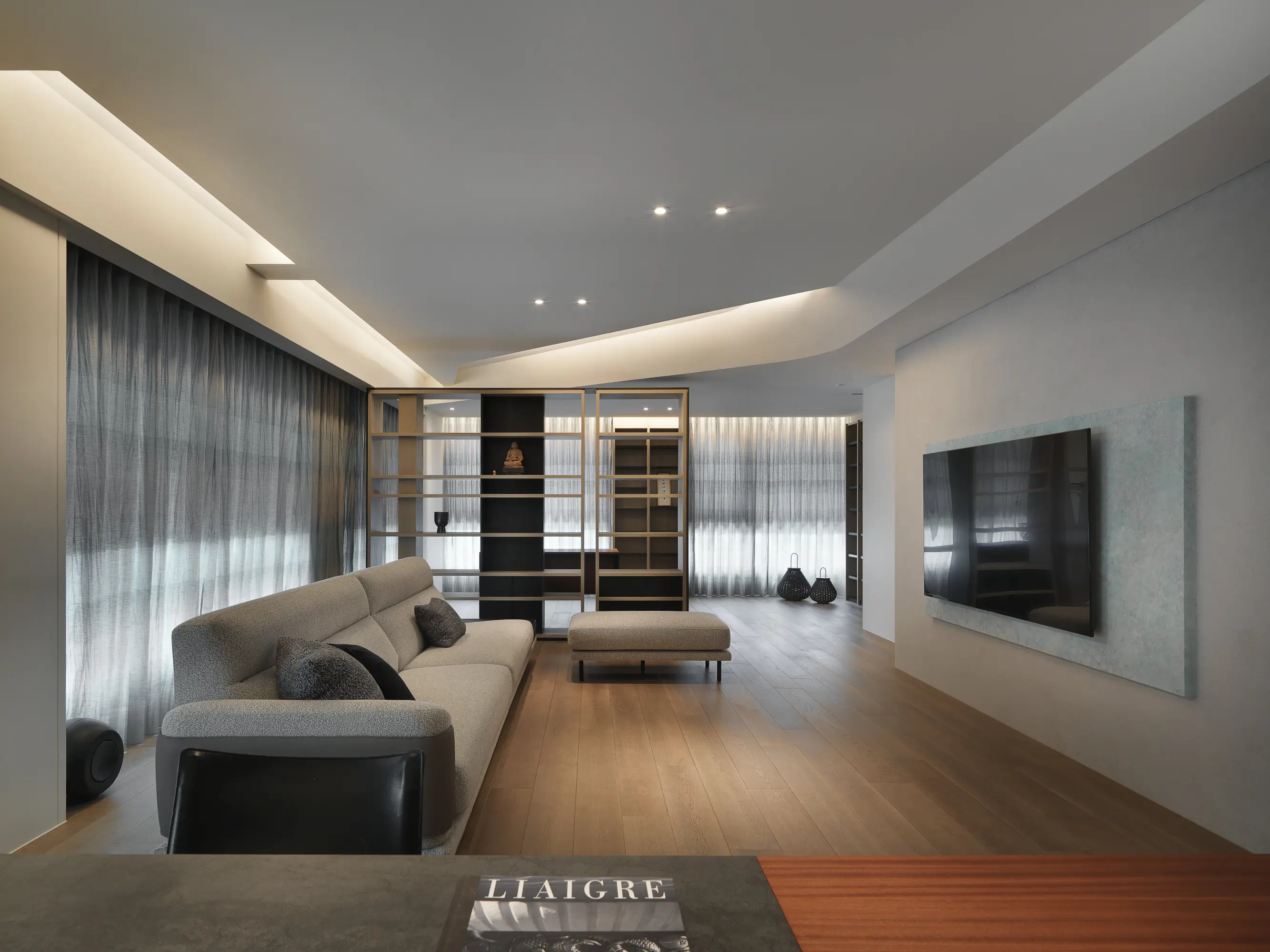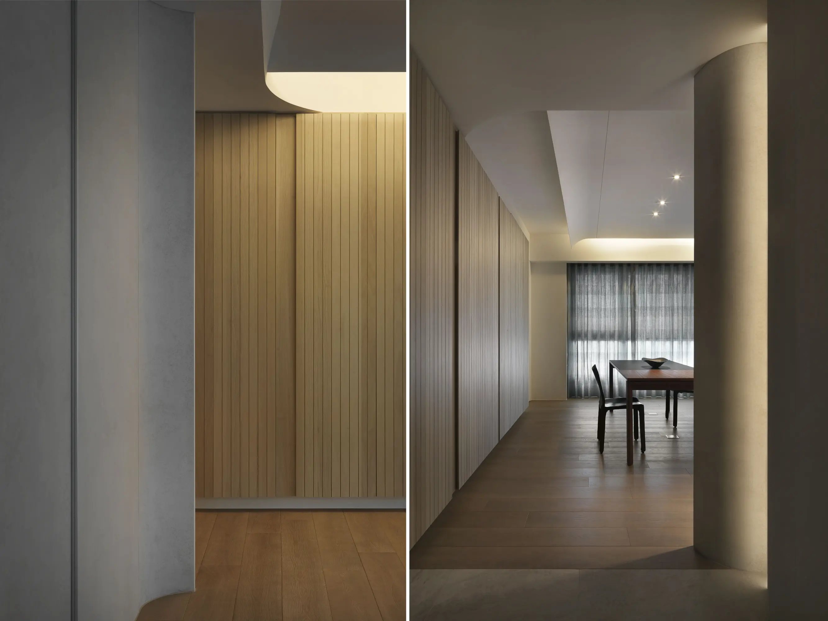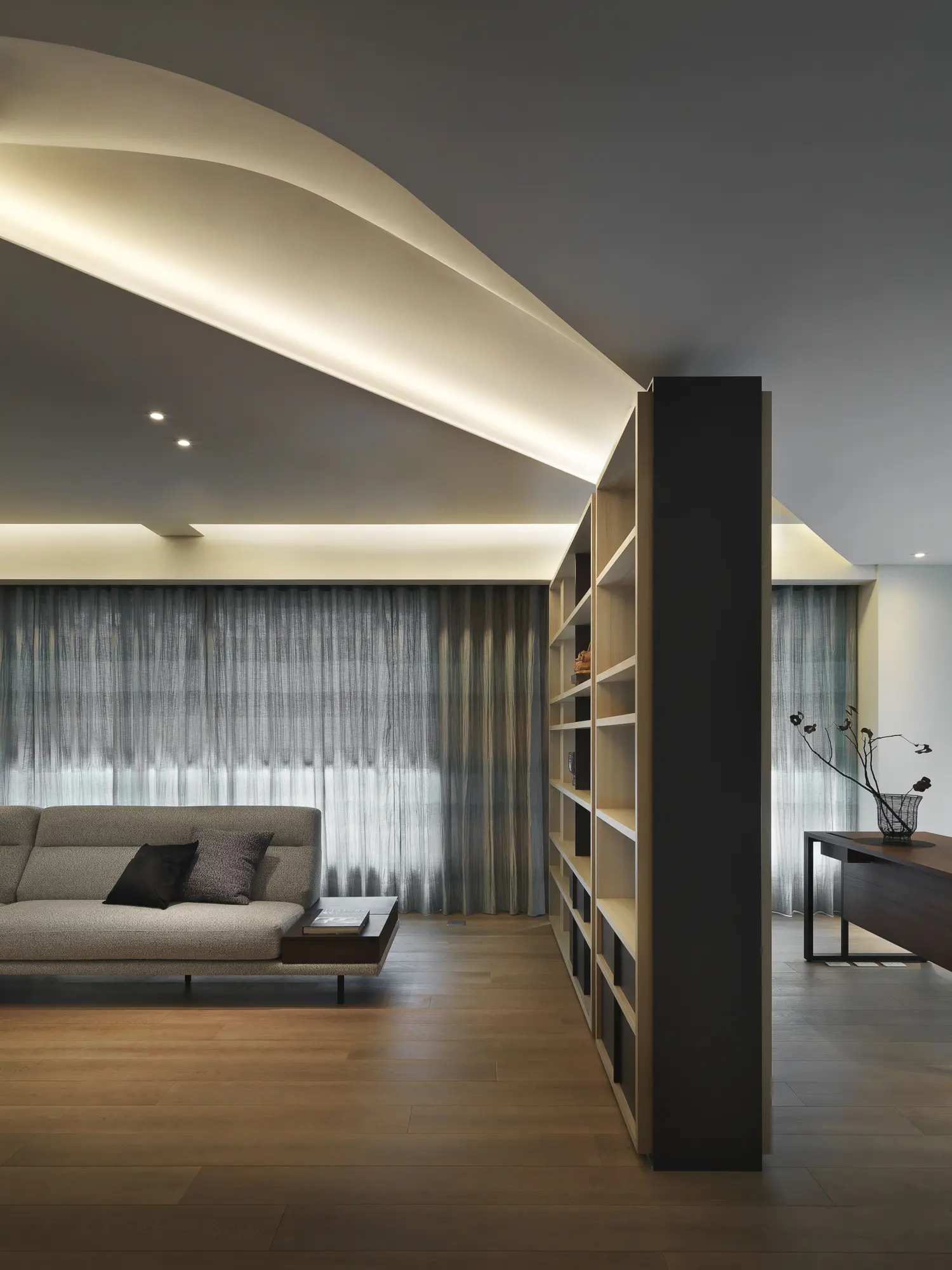 This serene retirement home reflects a senior couple’s shared passions of Literature through a design inspired by the structure of classical Chinese narrative (起承轉合). The layout guides movement from entrance to study, bedroom, kitchen, and dining, mirroring the fluidity of reading. The arc is reminiscent of the curvature of a rolled paper. The living room and study are separated by a sturdy bookcase, balancing lightness and openness. Light and shadow play on the ceiling adds literary magic, while visual elements inspired by Chinese character "冊" (books) expresses warmth and humanism.