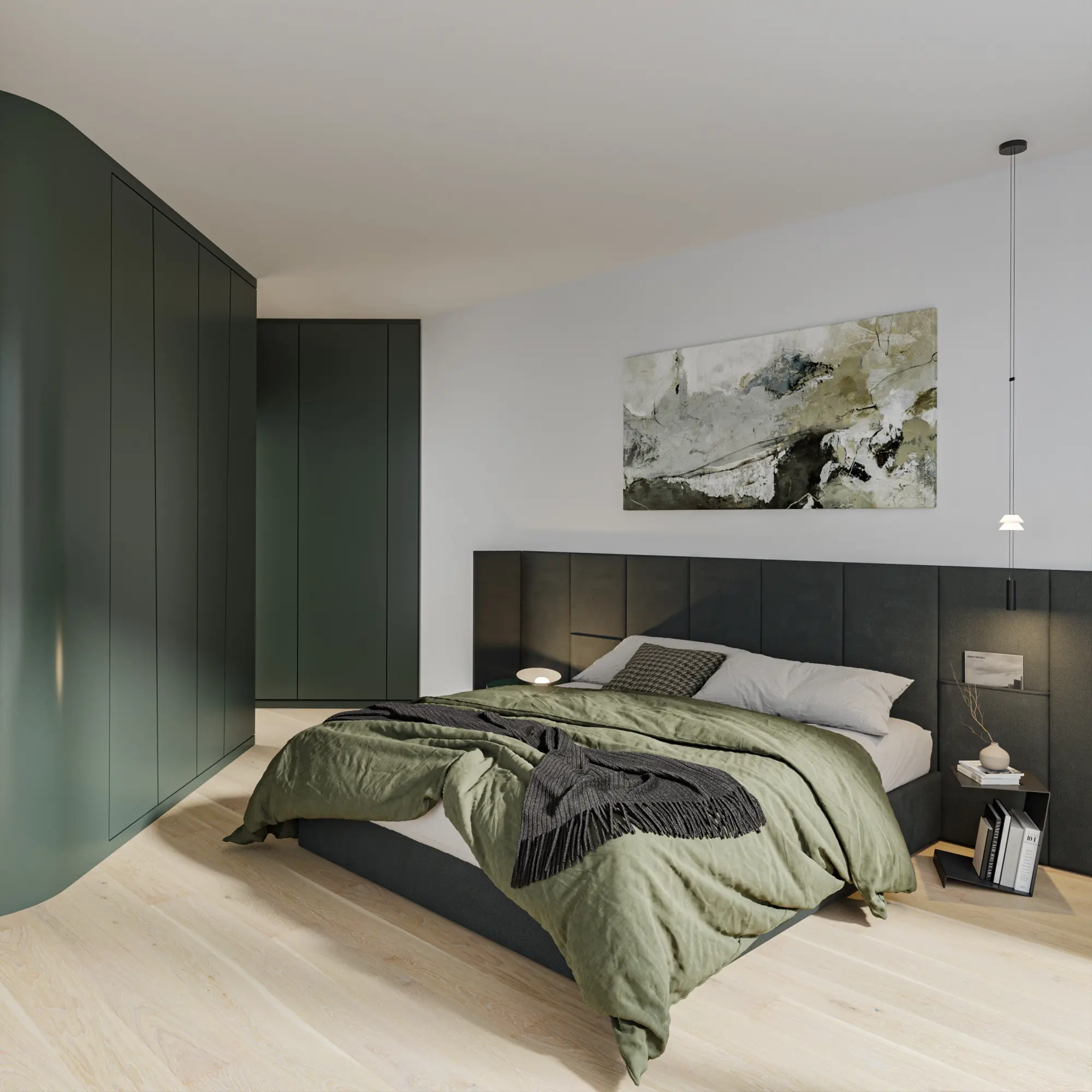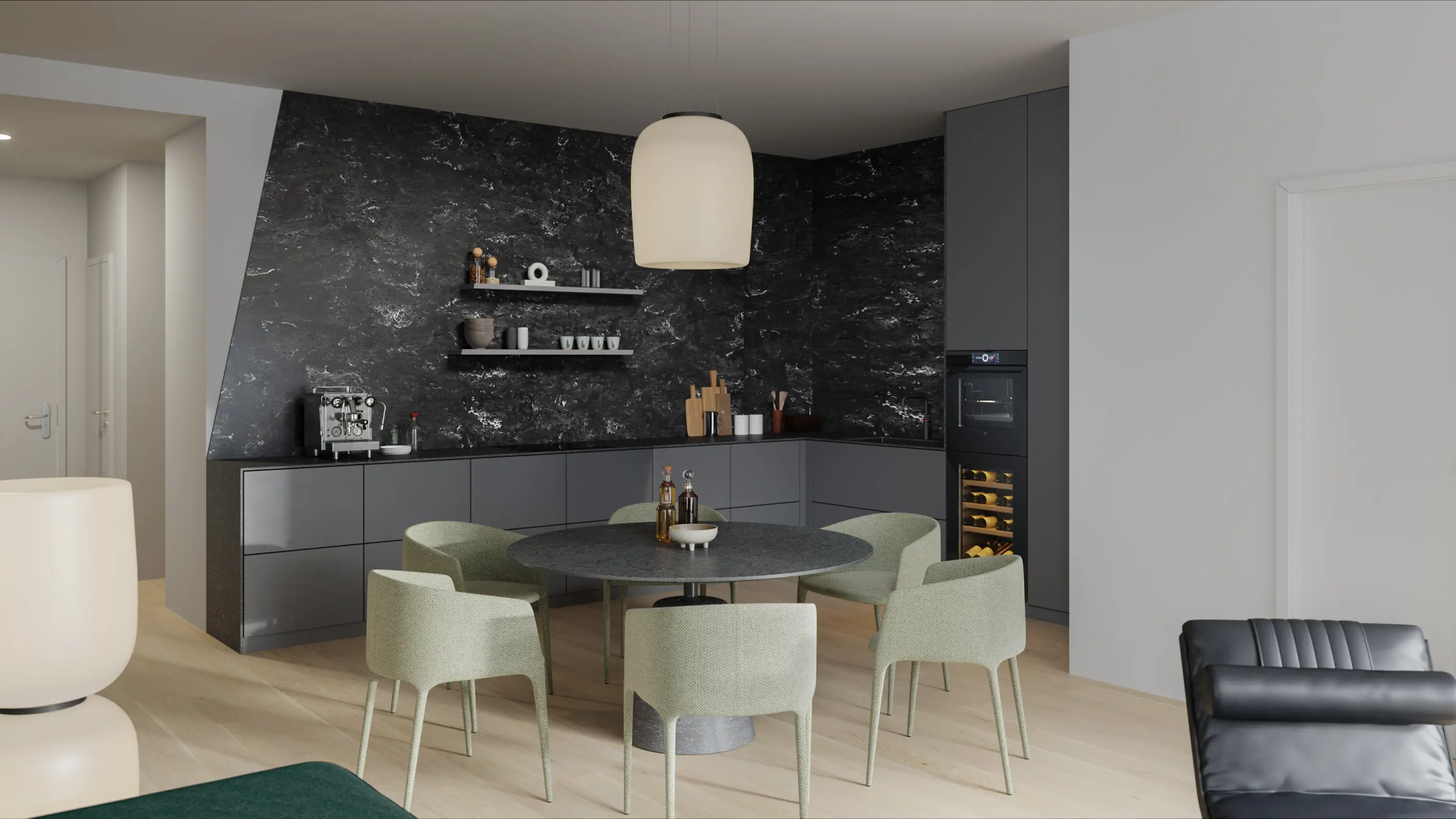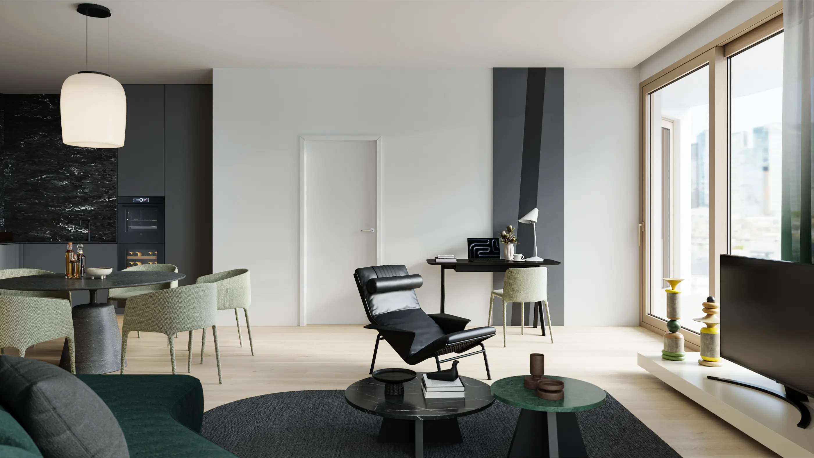 Modern elegance and avant-garde clarity merge into urban living culture in our concept for an apartment at FOUR Frankfurt. The building's unique design language was incorporated into the interior design and is reflected in the angles and radii of the custom-made furniture. Long-lasting materials, bold colours, sustainably manufactured products and lively accents form the substance of the high-quality furnishings, which interact with the trends of the surrounding cityscape. The result is an interior that cultivates a conscious, sustainable lifestyle.