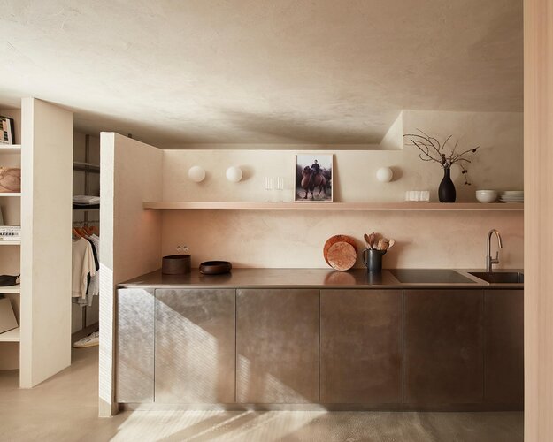 The 26 m² tiny apartment is an exemplary case of microliving at its finest. Through deliberate simplification, a special home was created, featuring a kitchen, sleeping nook, and ample storage space. Walls and ceilings are finished with lime plaster. The 4-meter long bespoke kitchen in stainless steel contrasts with installations made of white oiled larch. A wooden-clad cube conceals the bathroom and provides additional storage with its flat cabinets. Unique vintage furniture adds warmth, while blinds create a pleasant lighting atmosphere. This apartment demonstrates how every square centimetre can be effectively utilized in a small space.