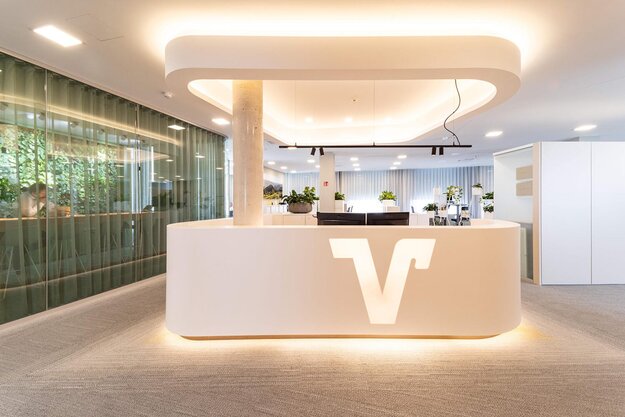 The new office building of Volksbank Stuttgart in Fellbach offers modern, flexible work and consultation spaces across two floors. The ground and first floors feature open-space areas for 25 employees, as well as conference and meeting rooms. The interior design is inspired by the landscape of the Fellbach vineyards, with flooring that reflects the changing seasons and consultation rooms in red and white wine tones. A large green wall and numerous plants create a pleasant atmosphere. Sustainable materials with a focus on reuse and repair were utilized.