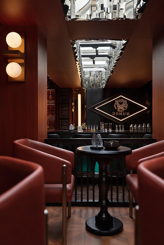 The interior architecture of the whisky and cocktail bar captivates with its strategic use of space, creating diverse social settings. The open ground floor offers an inviting atmosphere, while the compact upper area provides subtle intimacy for conversations. »BAR JANUS« seamlessly merges functionality with social interaction.
