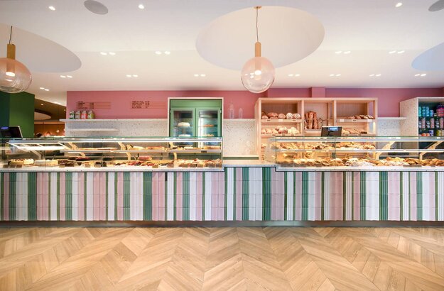 The finest French pâtisserie meets modern, contemporary ambience - after an extensive core renovation, a large, dark commercial space shines in new splendour. For Café Sa‘SIS, we reorganized the entire space and created exciting details, such as the recessed ceiling domes. The imaginative material mix of glazed 3D tiles, terrazzo surfaces, raffia and wood, combined with the gaudy colour scheme of pink and green shades, creates an emotional look, which implates a unique feel-good atmosphere.