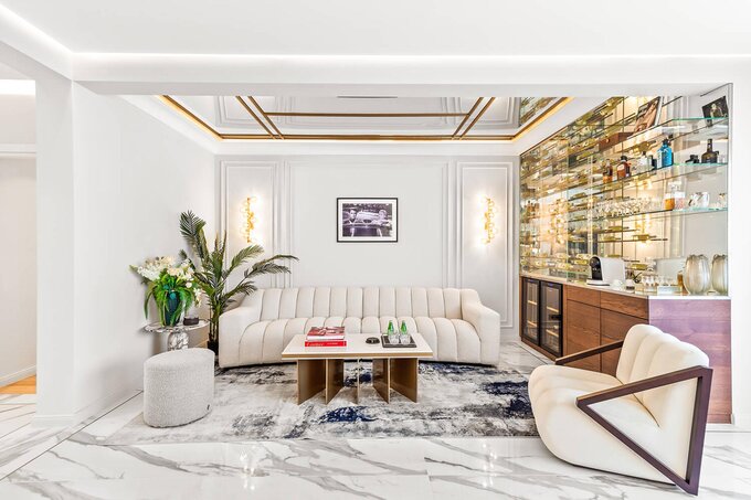 For this apartment we created a series of living room, dining room, kitchen and the use of mirrors which will multiply the volumes and increase the brightness of the rooms. The living room sees its ceiling accommodate a mirror, a repeated tip to dress the back of the bar the feeling of height and depth is undeniable. We like to play on the surprise effect and the sometimes theatrical character of an interior. An apartment must offer a scenographic and architectural journey. The master bedroom perfectly illustrates this quest for the unexpected. Wooden cladding occupies an entire section of the wall and hides access to the bathroom.