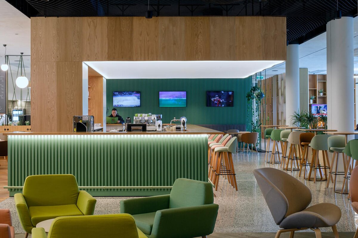 The interior architecture of the »LOBBY HOLIDAY INN, PRAGUE« impresses with an open concept that thoughtfully extends the room's functionality. The central bar forms the communicative centerpiece, serving as a café during the day and a social hub in the evening. Diverse pavilions create a varied yet harmonious atmosphere.