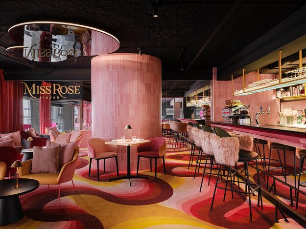 With its striking design, the pop-up restaurant/bar “MISS ROSE BISTRO” offers a sensual experience that celebrates the strength of feminine elegance. The use of bold colors in combination with decorative elements and textured surfaces creates an exciting contrast to the strictly linear concrete architecture of the building, which together create a special atmosphere.