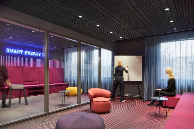 NEW's headquarters combine sustainability, flexibility, and aesthetics: The refurbishment of the existing building conserved valuable resources and reduced the ecological footprint. Flexible spatial structures also enable the company to dynamically adapt to changes without the need for restructuring or relocation. The design reflects NEW's corporate values by promoting collaboration and creativity through transparency and multifunctionality.
