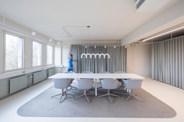 The “Alte Jakobstrasse” showroom impresses with its clever room layout, which combines functional flexibility and aesthetic elegance. The combination of transparent partition walls and a flexible acoustic curtain creates a harmonious interplay of openness and privacy, supported by a carefully coordinated color palette that underscores the feeling of dynamism and calm.