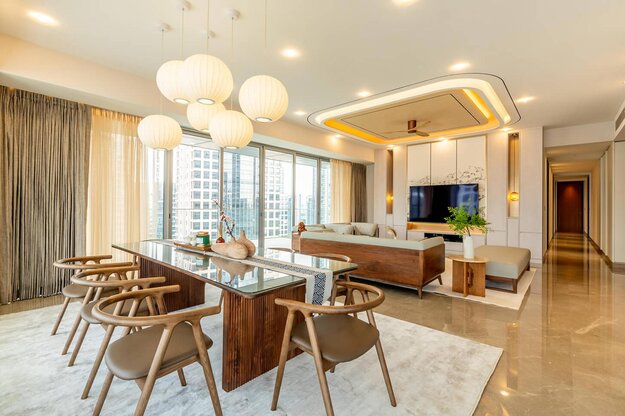 The luxurious home at 88 Orchard Boulevard showcases modern elegance with a warm, inviting ambiance. The open-plan living and dining areas feature natural wood elements, sleek furniture, recessed lighting, and a wooden fan. A glass-top table with sculptural chairs and pendant lights adds sophistication. The neutral colour palette of creams and beige contrasts beautifully with rich wooden textures, while large windows offer panoramic city views. The minimalist bedroom highlights serene wall art and integrated furniture, blending modern design with natural warmth for a stylish yet welcoming space.