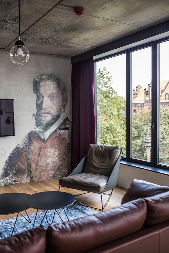 Located in the oldest part of Wrocław, the hotel boasts a unique combination of contemporary architecture and interior design with a historical feel. The lobby and restaurant interiors feature reproductions of medieval and Renaissance city panoramas, with portraits of famous 17th and 18th century inhabitants of Lower Silesia in the 184 rooms. The images, combining computer graphics and printing techniques on a special medium and further illustrated with handmade artwork, the images bring out the texture of the concrete walls and are based on paintings from the National Museum in Wrocław.