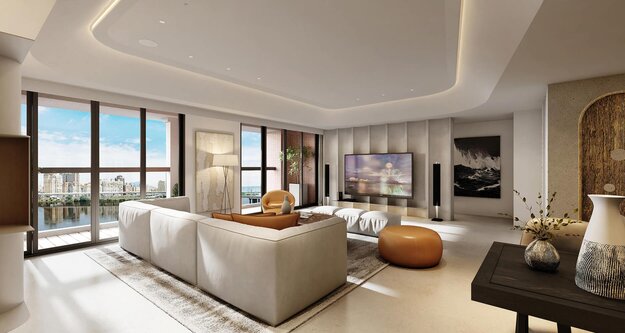It is an urban renewal project in northern Taiwan's commercial hub, offering views of the blue riverside highway and Taiwan's century-old prosperity. Designed for high-end retirees and returning entrepreneurs, it blends unique aesthetics with practical living. Public areas feature semi-circular lines for harmony and inclusiveness. Three suites cater to different generations: a senior room with brass screens and wood decor, a spacious master bedroom with mixed materials, and a dynamic children's room. A row of sofas along the window highlights the scenic view, enhancing the space with asymmetric proportions and three-dimensional lines.