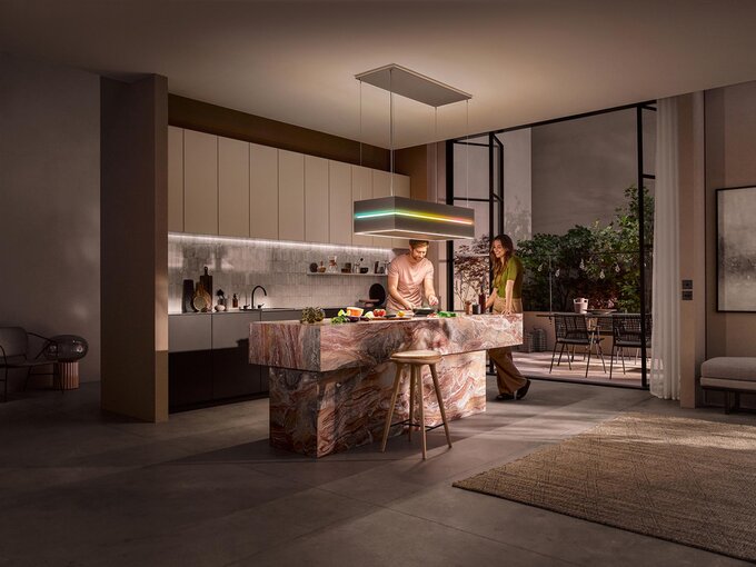 The berbel island hood Skyline Edge Play offers an innovative gesture control that enables touch-free operation. Functions such as lift height, light setting and fan adjustment can be controlled by hand movement. The motion lights provide atmospheric lighting with up to 12 selectable light sequences. All settings can be controlled via the berbel+ app. The ceiling connection plate is available separately, with options in stainless steel or glass in various colours to match the hood. The slim, elegant body of the hood and the versatile adjustment options make it a highlight in modern kitchens.