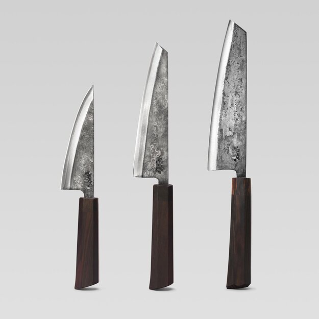 We have been continuously developing the design of our BLACK CHILI 3-piece combination ‘Profiset’ since 2015. The current Generation 5 brings functionality, aesthetics and ergonomics together at a new level. To achieve this, we are merging European and Asian knife traditions, running our own development laboratory and constantly incorporating customer feedback. The blades are forged by hand in small craft productions from former lorry springs, which we recycle. This high-quality carbon steel gives the blades their unique look, sustainability and extreme sharpness. The handles are made of ironwood and ebony.