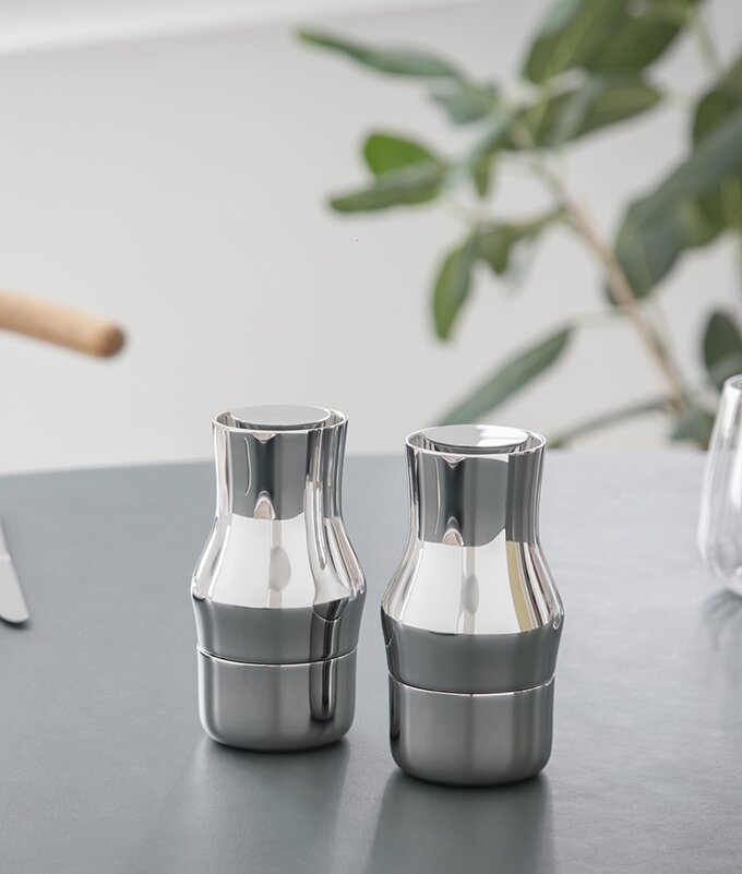 Inspired by the serene landscapes of Northern Sweden, the mill’s minimalist lines and flowing silhouette evoke the beauty of nature, transforming it into a centrepiece that seamlessly combines aesthetics with practicality. The Dorotea mill redefines the art of seasoning, merging form and function in an elegantly crafted, upside-down design. With the grinder positioned at the top, it ensures a mess-free table, while elevating the everyday into a sculptural statement piece. Crafted from recycled post-consumer stainless steel, its high-gloss and satin finishes complement any table setting, while the ceramic mechanism ensures precise grinding.
