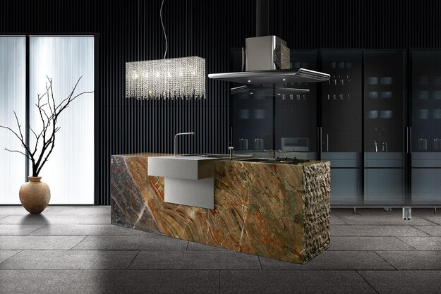 The exclusive “Kitchen ‘Sy’” kitchen impresses with its innovative use of marble. By hollowing out the solid block of stone, the natural grain of the material is retained all around. Another fascinating feature is the roughly hewn side, which forms an interesting contrast to the remaining smooth polished surface.