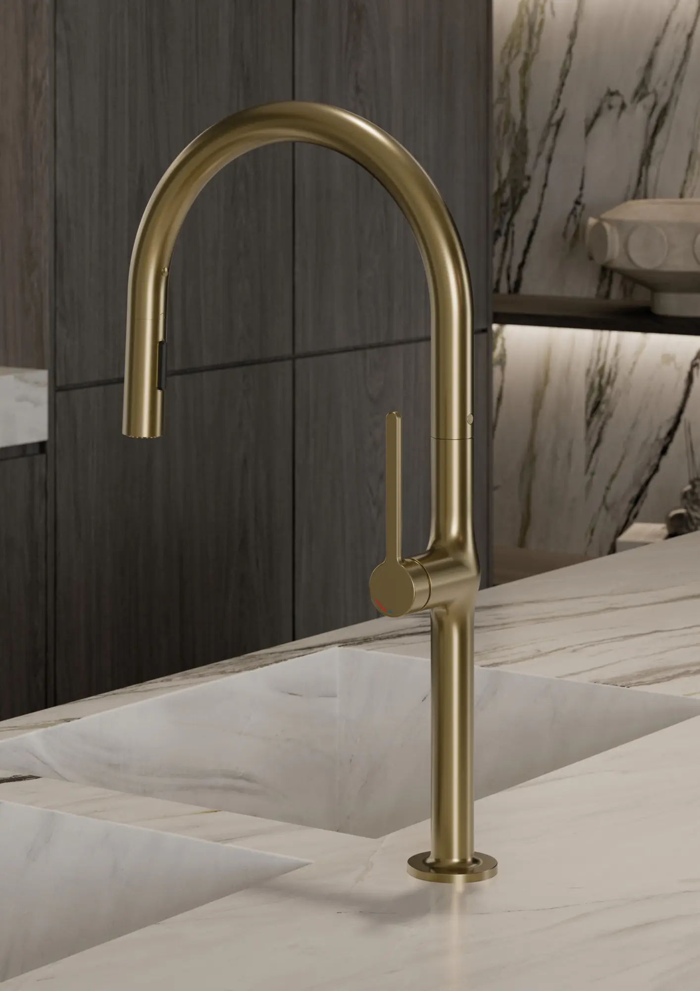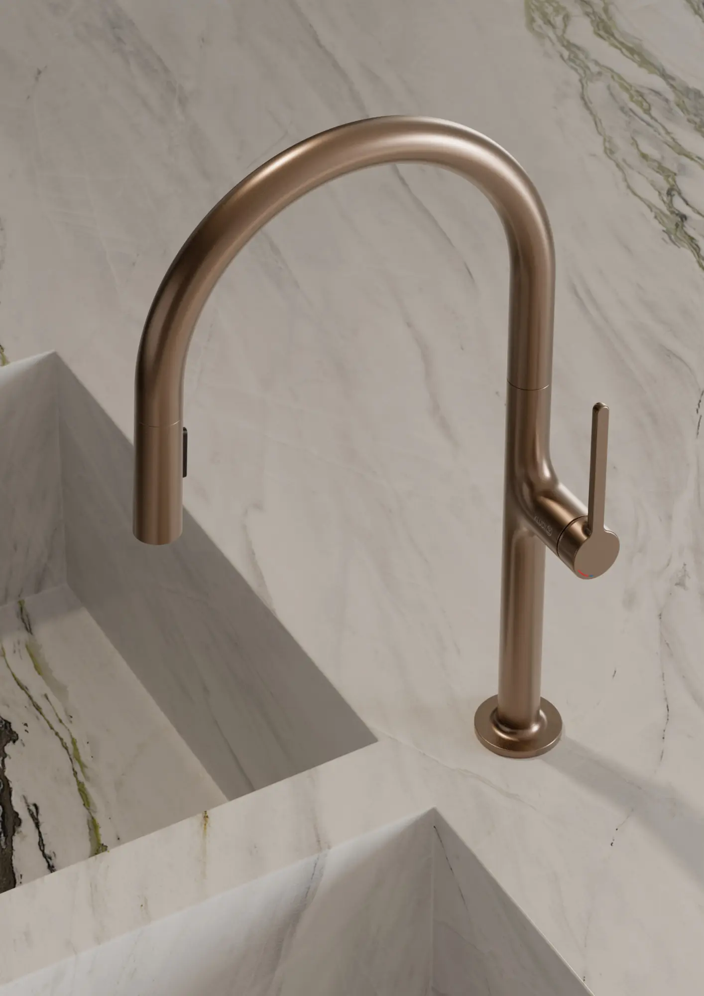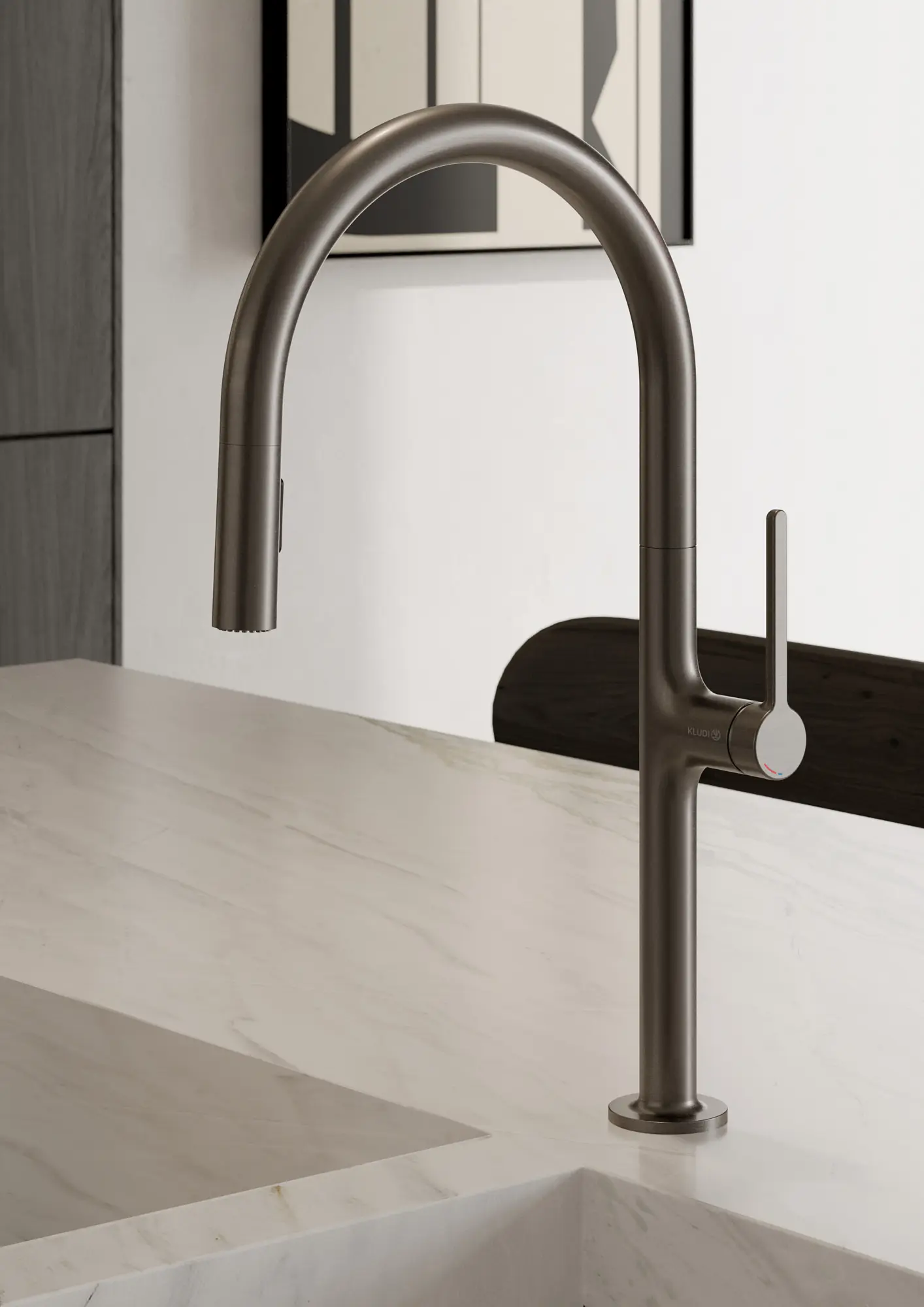 With REEF, we wanted to redefine the boundaries of conventional tap design – uncompromisingly slim, technically precise. An integrated spring mechanism in the spout allowed us to dispense with the usual flexible hose, enabling us to create a housing with a sculptural effect. The higher handle extends the silhouette, while the slim lever lends it graphic elegance. The cartridge also disappears flush into the body – for 360° aesthetics, as required by kitchen islands in premium interiors. REEF is made for rooms where design makes a statement.
