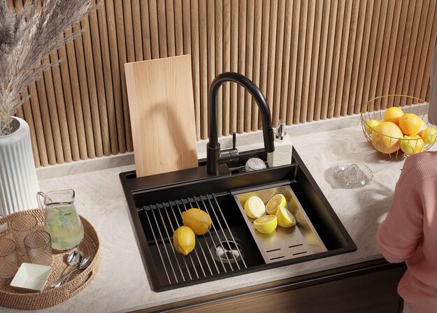 This kitchen sink provides an ingenious solution for organizing kitchen accessories. Featuring an integrated organizer and a drainage system, it enhances hygiene. The multilevel design allows versatile workflows, which is especially valued in modern kitchen environments. The »Oslo 60 Pocket Multilevel« kitchen sink meets the demands for functionality and efficiency.