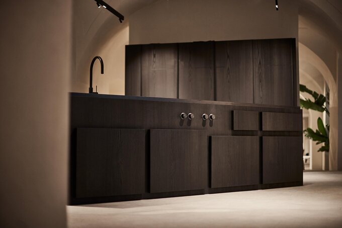 Inspired by the traditional shape of a table-top stove, the “#relief.1657” plays with surfaces and elements that contrast sculpturally with the monolith. The raised worktop echoes the design element of the relief, while the doors of the cabinet and the table deliberately interact with the kitchen body through carefully applied ornamental inlays. An additional feature is the freely movable wooden chopping board, which allows for maximum flexibility when working. The understated character is created by the interplay of the dark wood and the durable ceramic-stainless steel-surface, materials which give the kitchen an overall harmonious feel.