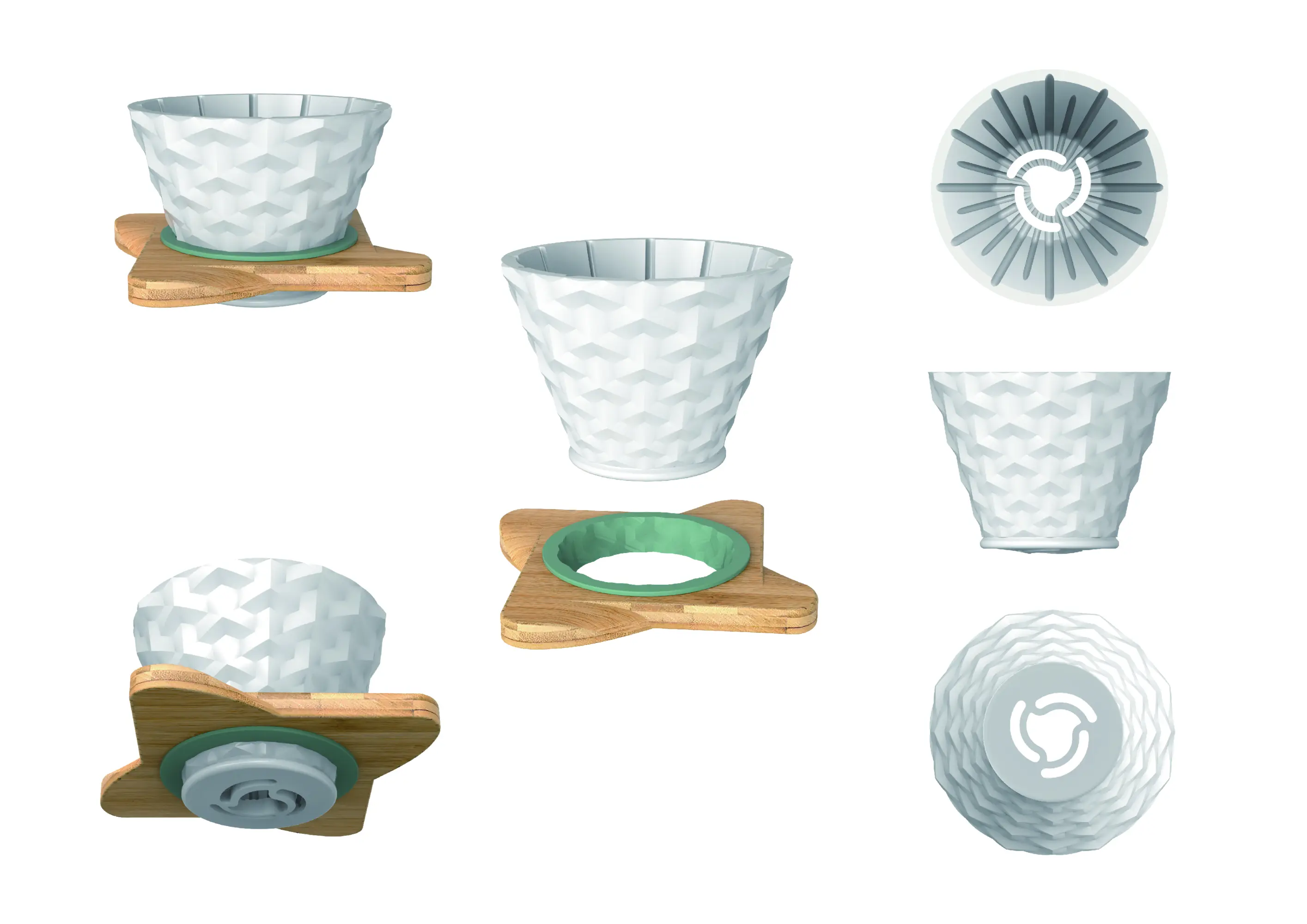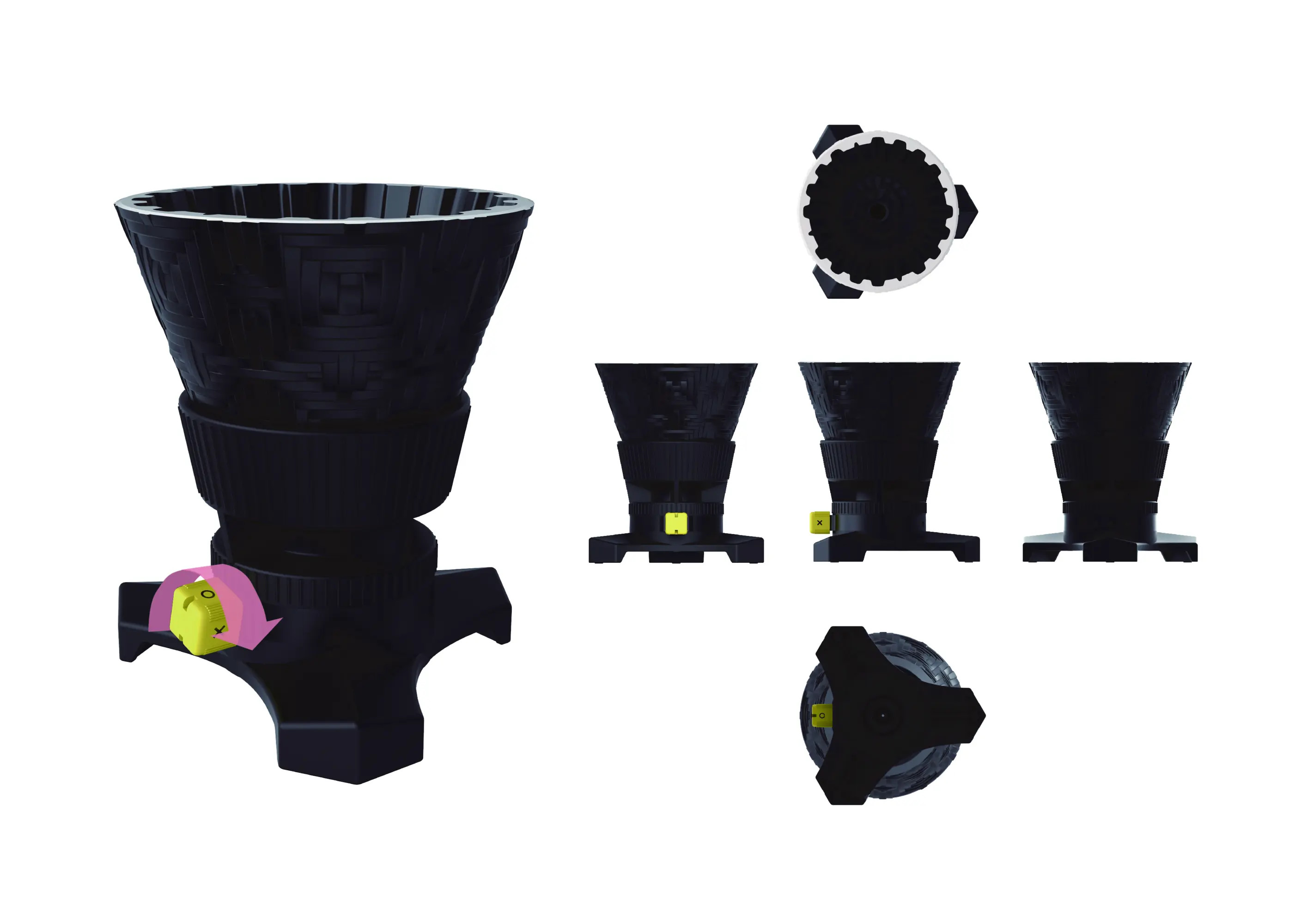 The closed-lid brewing design of the Rock 'n' Dew Coffee Glass Server seals in aroma, delivering a magnified flavor upon opening. The wave-textured interior guides water flow. An internal baffle at the base facilitates efficient swirling for full aroma release, and the ergonomic handle provides a secure, heat-resistant grip. The Tri-Spin dripper series features a switchable base for Immersion/Drip brewing, simplifying the process while enabling precision. Its engineered rib structure promotes uniform extraction and crisp flavor. The tri-spin base enables rapid, stable extraction.