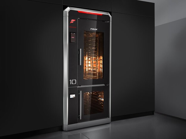 The rotating convection oven impresses with advanced technology that reduces steam development, optimizing product quality. Its dual operation with electricity and natural gas offers flexibility for diverse users, while the compact design with a concealed hood system provides a modern aesthetic. »ROKON-FRN10« is a solid industrial product that convinces with functionality and elegant design.