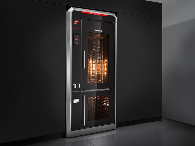 ROKON - FRN10 is a rotating convection oven designed for enterprises producing bakery products. Its capability to operate on both electricity and natural gas enhances its versatility, while appealing to a broad range of users. The advanced “Super Vacuum Technology” contributes to maintaining product quality by minimizing the steam released during cooking. The vacuum unit is located in the concealed hood. Thanks to the concealed hood system, the traditionally used hood attachment is eliminated, giving the product a compact and elite appearance.