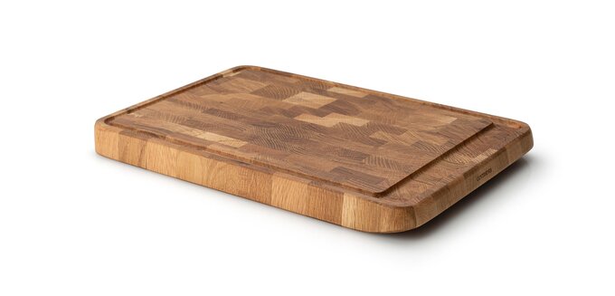 The oak cutting boards offer a sophisticated blend of functionality and aesthetics. The precise construction with visible growth rings promises a durable and resistant surface, while the slightly beveled underside makes it easy to lift.