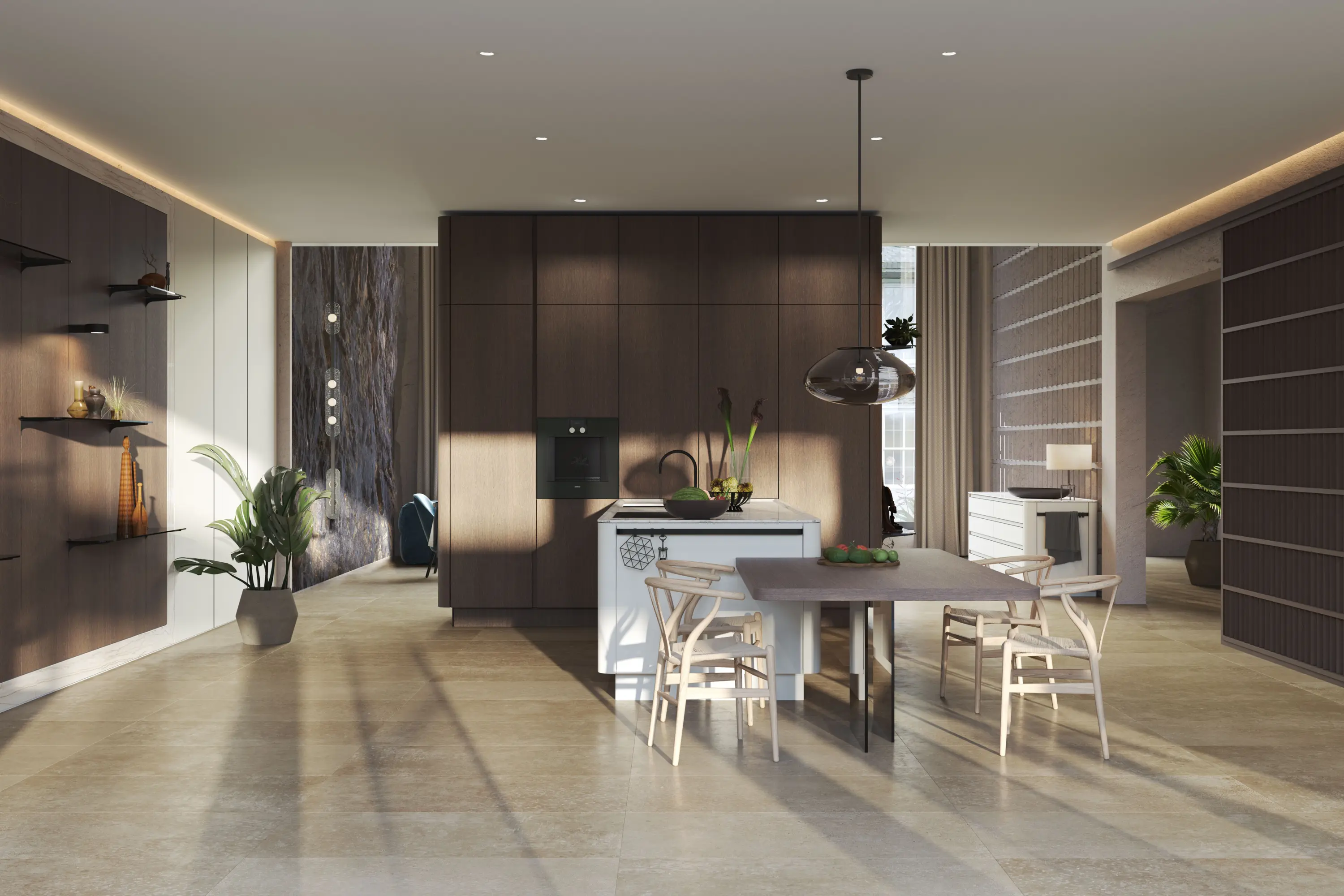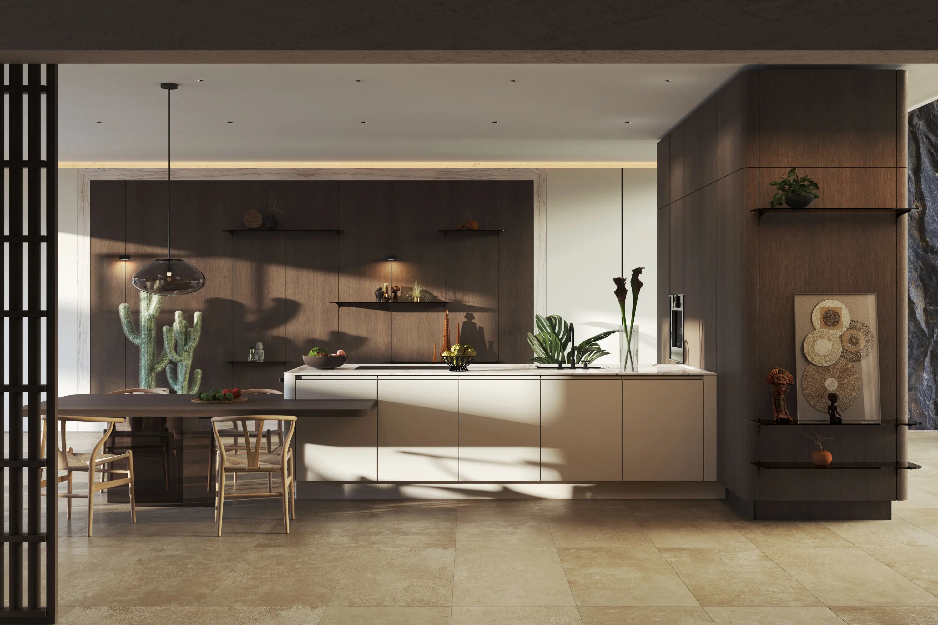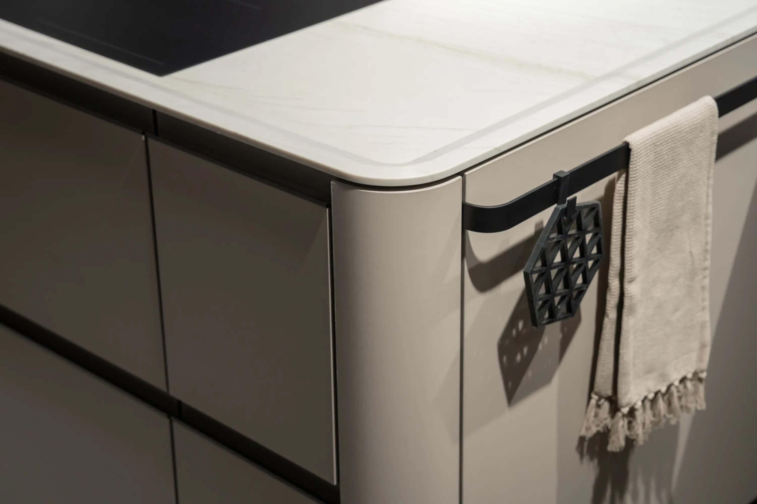 Thanks to its expressive design concept, the SieMatic SG6 has an immediate impact on the atmosphere of a room. The most striking features are the solitary, compact furniture design, harmonious curves and grip profiles in black or with additional inlays in front material. Characteristic: standalone look with rounded corners, which can be used as room and wall end elements. Cabinets literally float in front of the wall. Worktops with a raised edge continue the curve of the shaped side panels on the inside and outside. Railings, shelf supports, shelves and lights can be positioned as desired. A deliberate symbiosis of aesthetics and function.