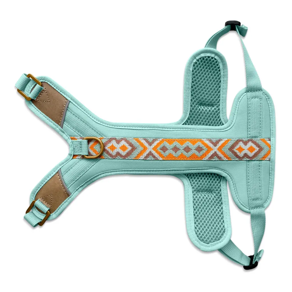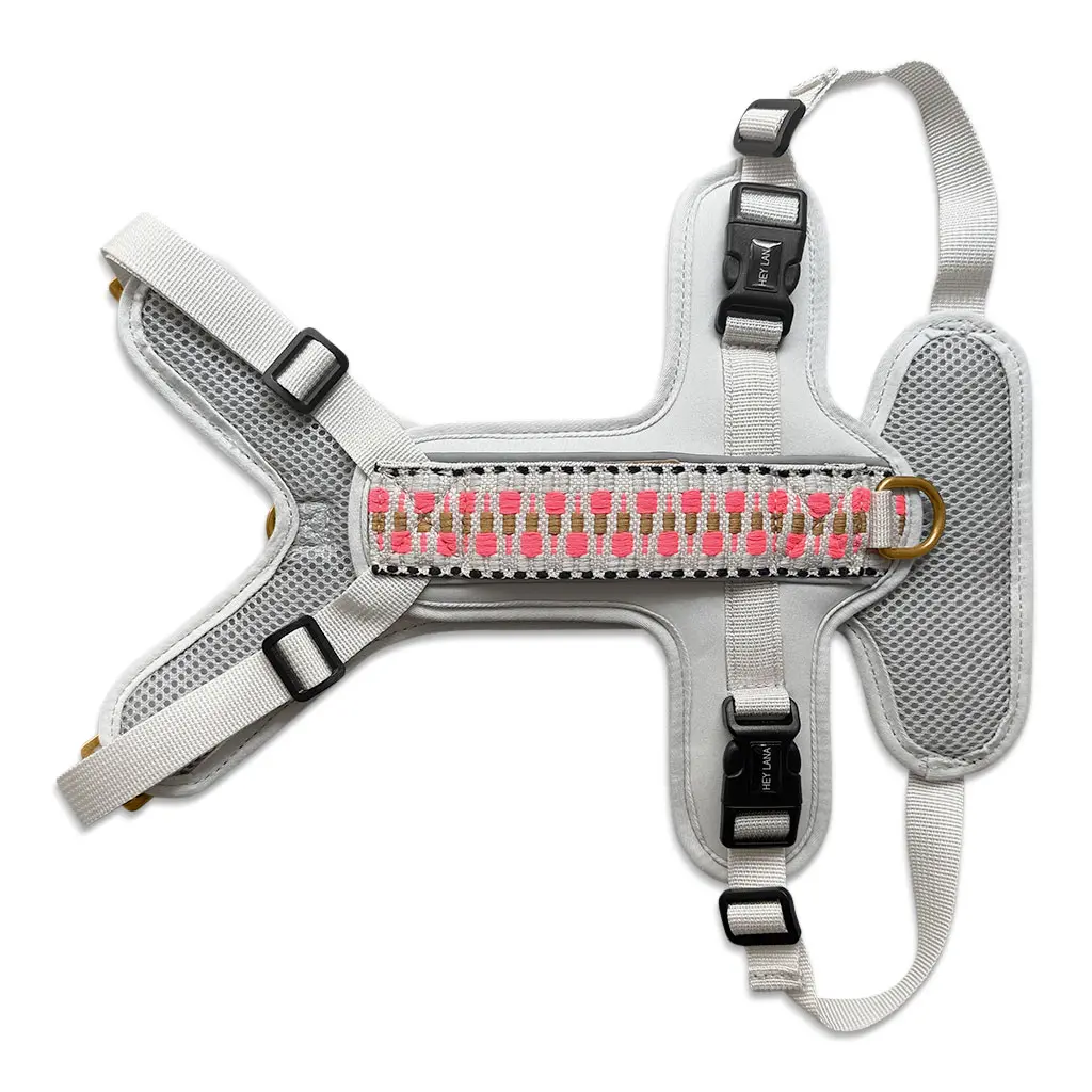 The Premium Dog Harness combines ergonomic comfort with a thoughtful design concept. Each model features two harmoniously coordinated colour elements and a custom-made webbing strap made of patterned organic cotton – for a stylish accent. The deep V-neck protects the throat, while breathable mesh and padded neoprene ensure long-lasting comfort. Four-way adjustability with SlipLok buckles guarantees a secure fit. Two D-rings allow flexible handling, a back handle provides added control. Reflective seams improve visibility. Vegan, ethically made, available in 6 colours and 4 sizes.