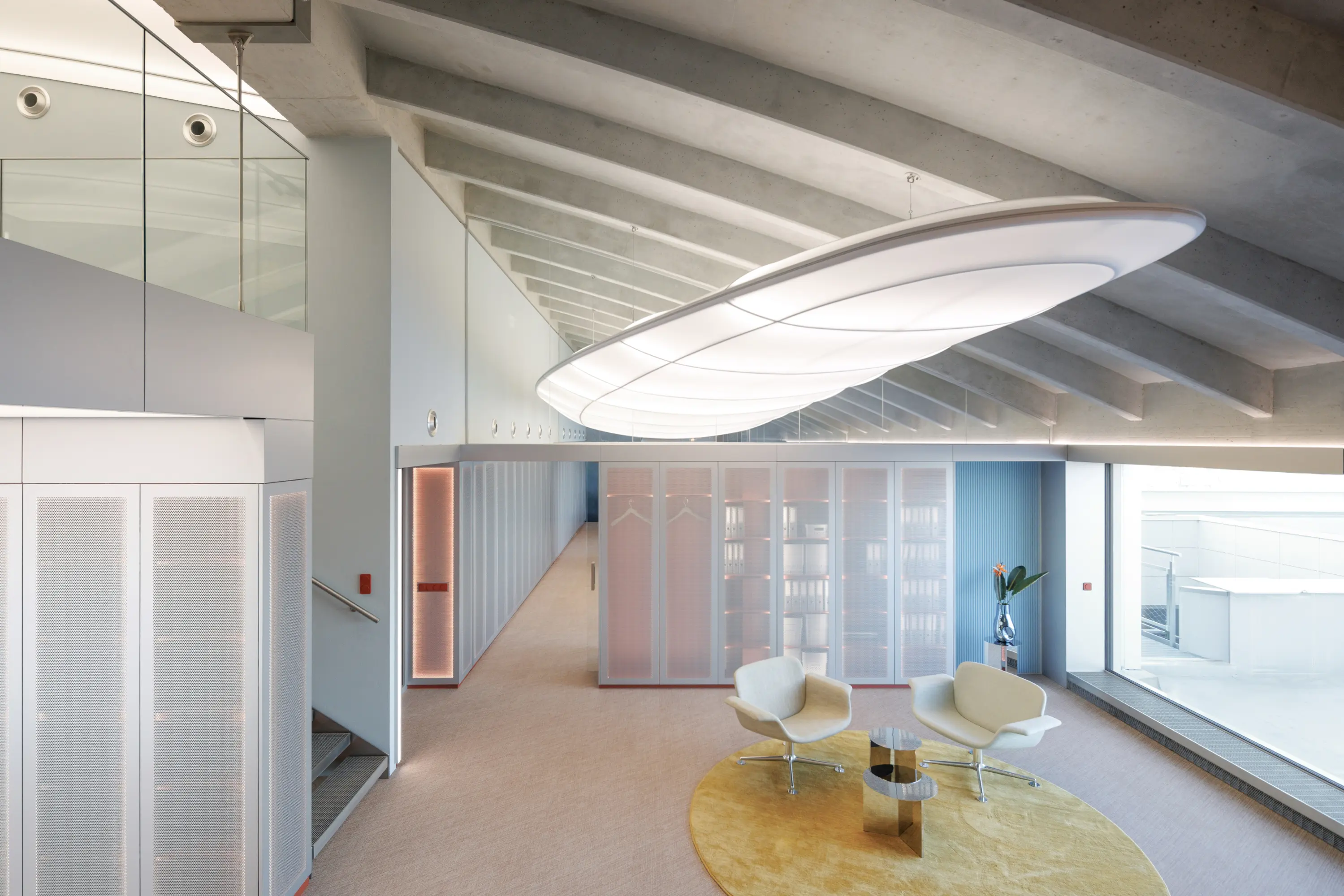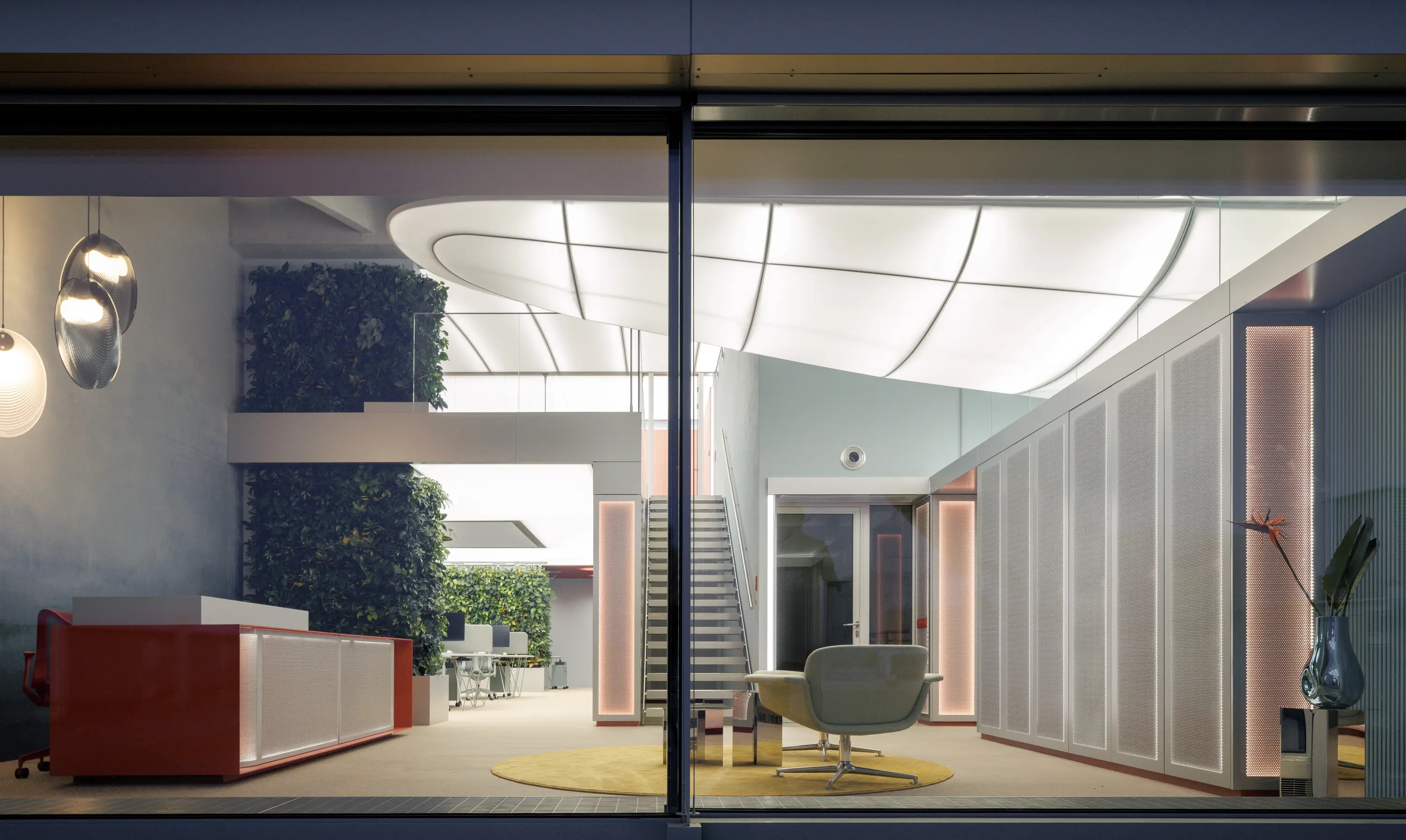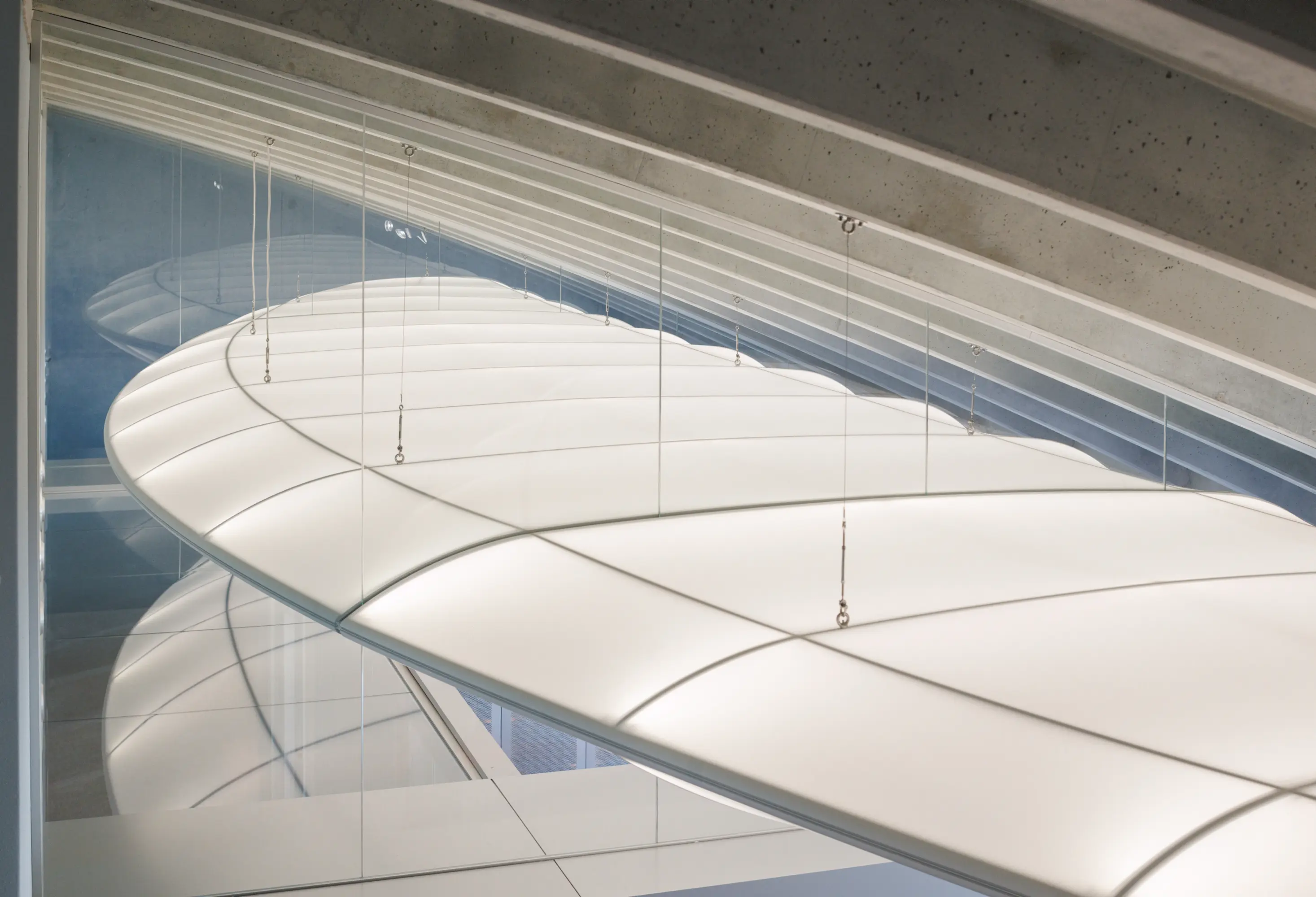 The Blueriot project transforms a 1990s office, solving its lack of daylight. Central to the redesign is the 16-metre “whale wing,” made of aluminium, 3D-printed parts, and Barrisol membrane, spanning two arched glass panels. The underside is finished with micro-perforated Barrisol Acoustic membrane, which contributes to improved acoustic absorption (reflection attenuation) and ensures an even light diffusion. The form of the object also helps to optimise airflow as part of the HVAC system. Inspired by aviation and ocean themes, the design features coral red, deep blue, raw concrete, and plant-covered pillars linking tech and nature.