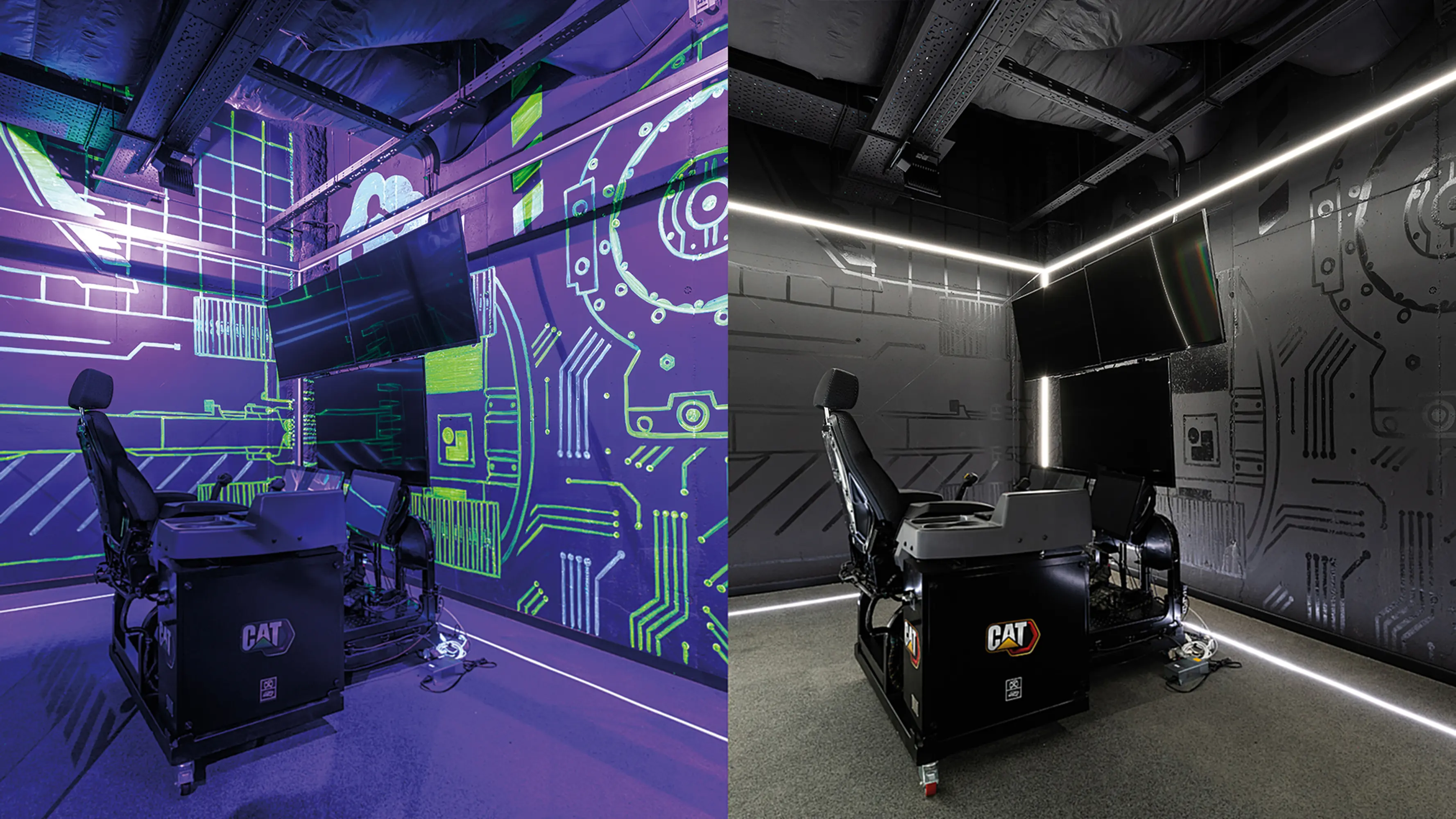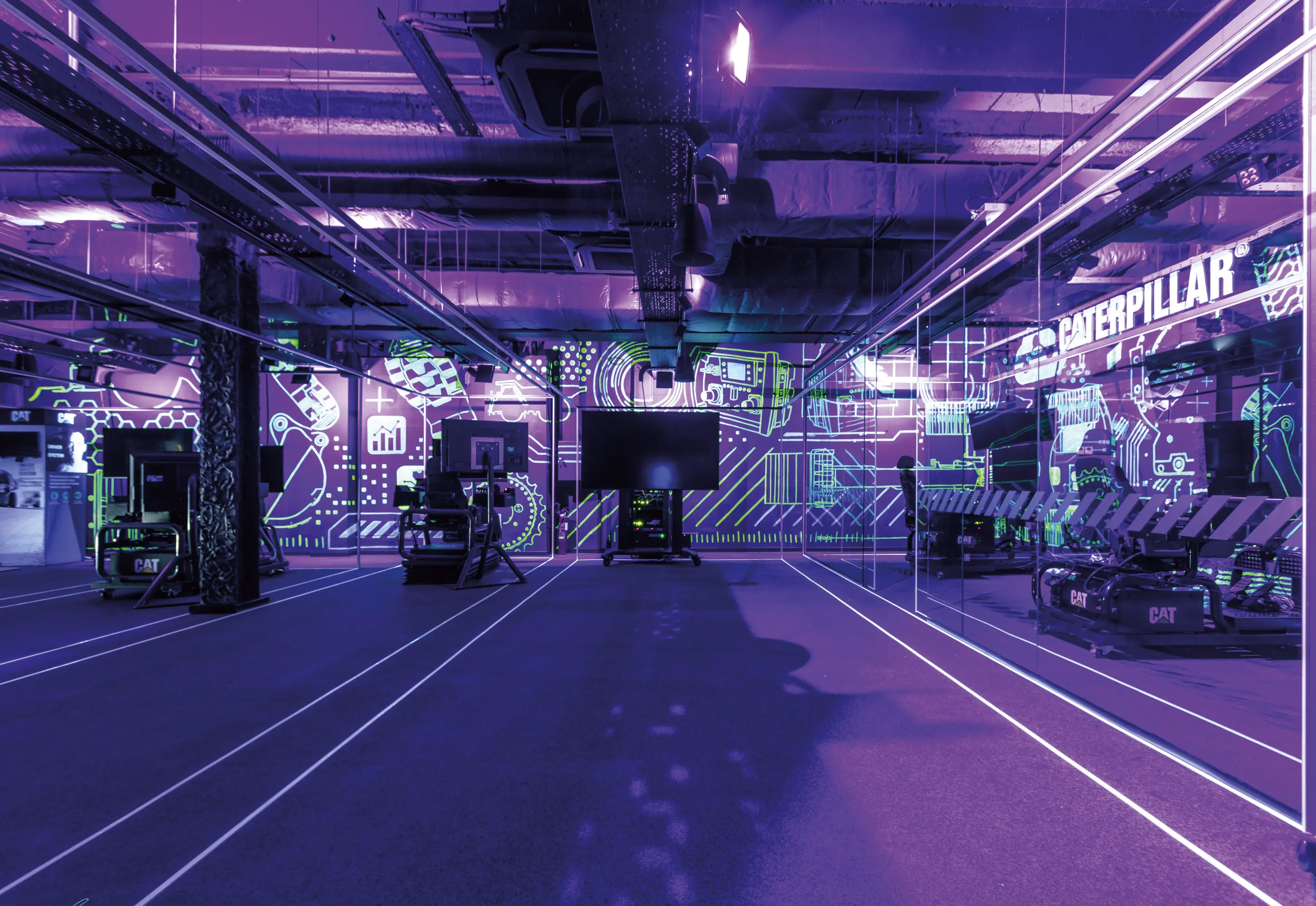 Caterpillar, a leader in construction machinery, takes the UX to the next level and creates its new technology showroom. The room serves as a training and demonstration area, featuring simulators and remote controls for operating the machinery in real time. The goal was to create an innovative, flexible, and chameleon-like space. Light plays a crucial role, transforming the space and creating the project's wow effect. The light show goes from displaying photoluminescent corporate graffiti to offering a vision of carefully crafted wire prisms of light that highlight Caterpillar's technology. The space combines a futuristic and grunge aesthetic.