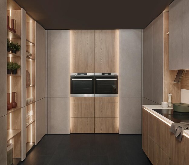 The planning concept with a lighting system elevates the interplay of light and space to a new level. The use of concealed light profiles creates an emotional atmosphere that combines functionality and aesthetic uniqueness. The integration of the CONNECT shelving system highlights the innovative design strength of the "Faceline-Konzept."