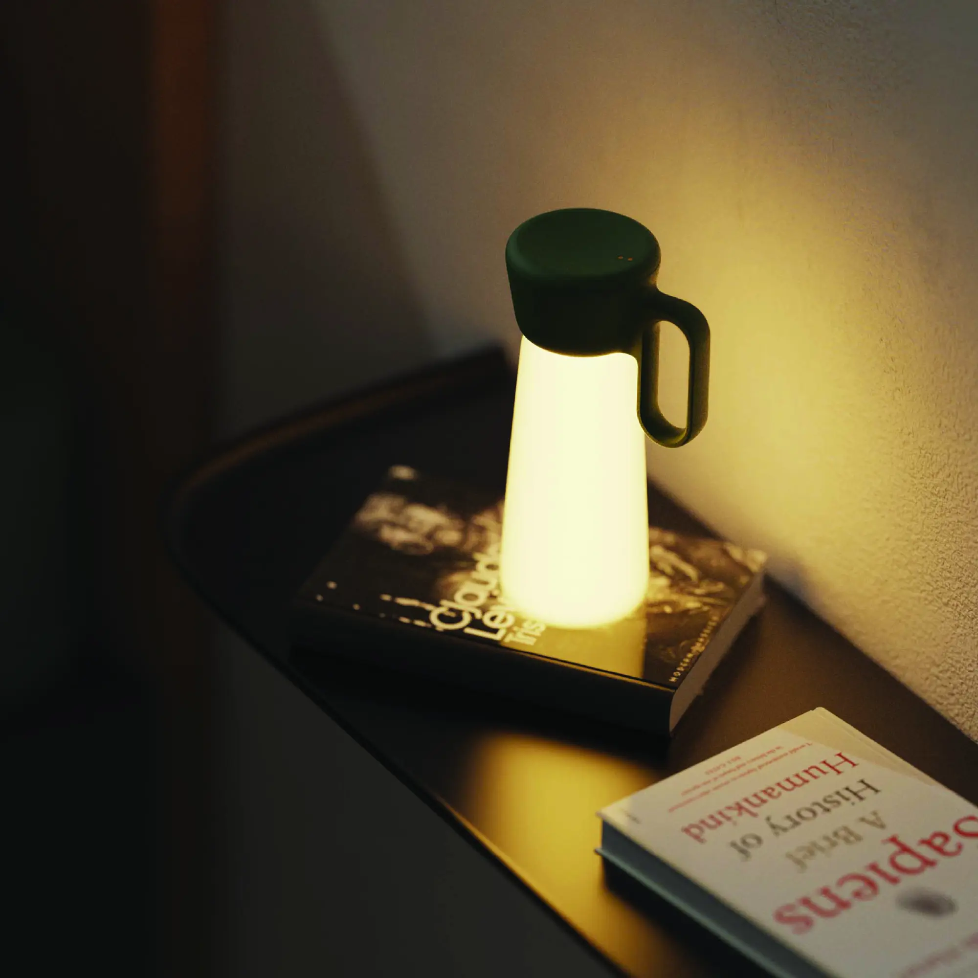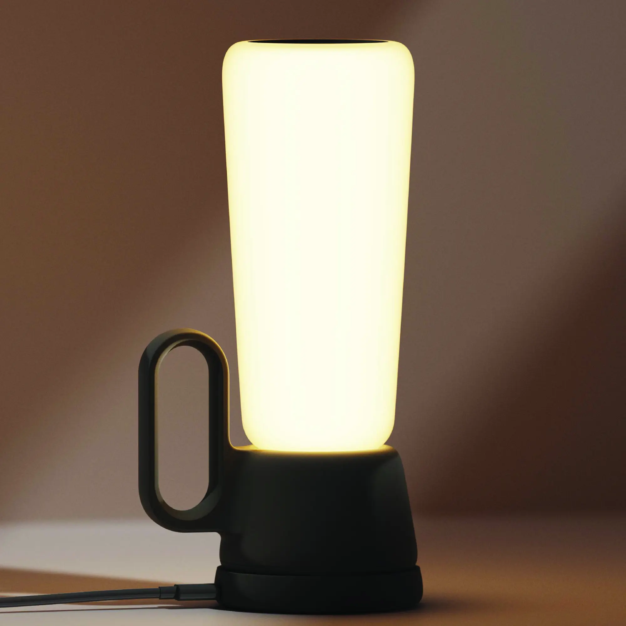 Betty: Timeless Portable Illumination. Inspired by 18th-century Betty lamps, our modern rendition fuses geometric purity with practical elegance. Intuitive on/off by pressing the diffuser/base and dimming via simple diffuser rotation. Its dual-cylinder form allows versatile lighting orientations. The ergonomic race-shaped handle enhances portability. Gracefully charges on its base. A sculptural design blending minimalism and functionality, making Betty a conversation starter. Rooted in history, designed for the future.