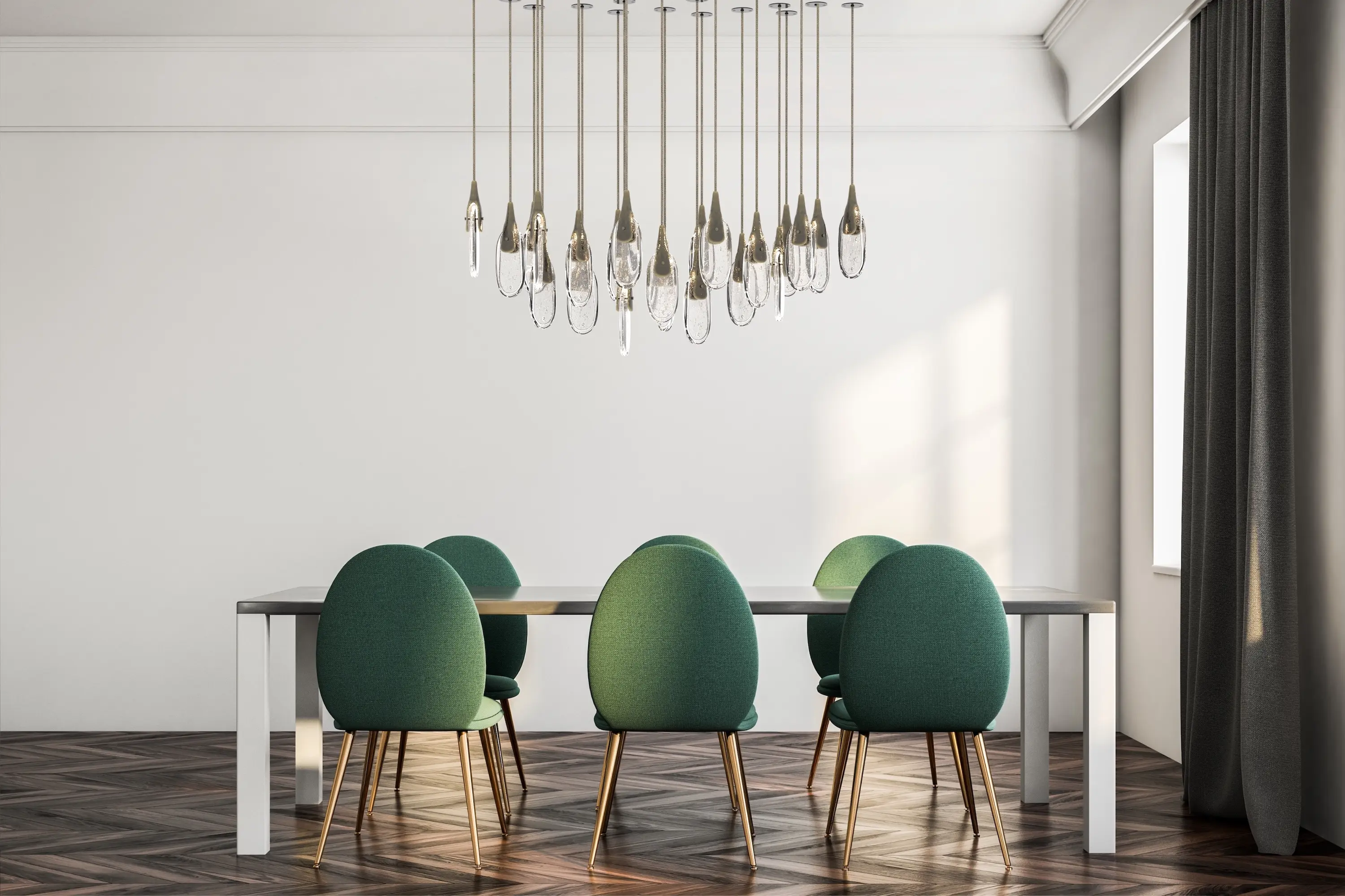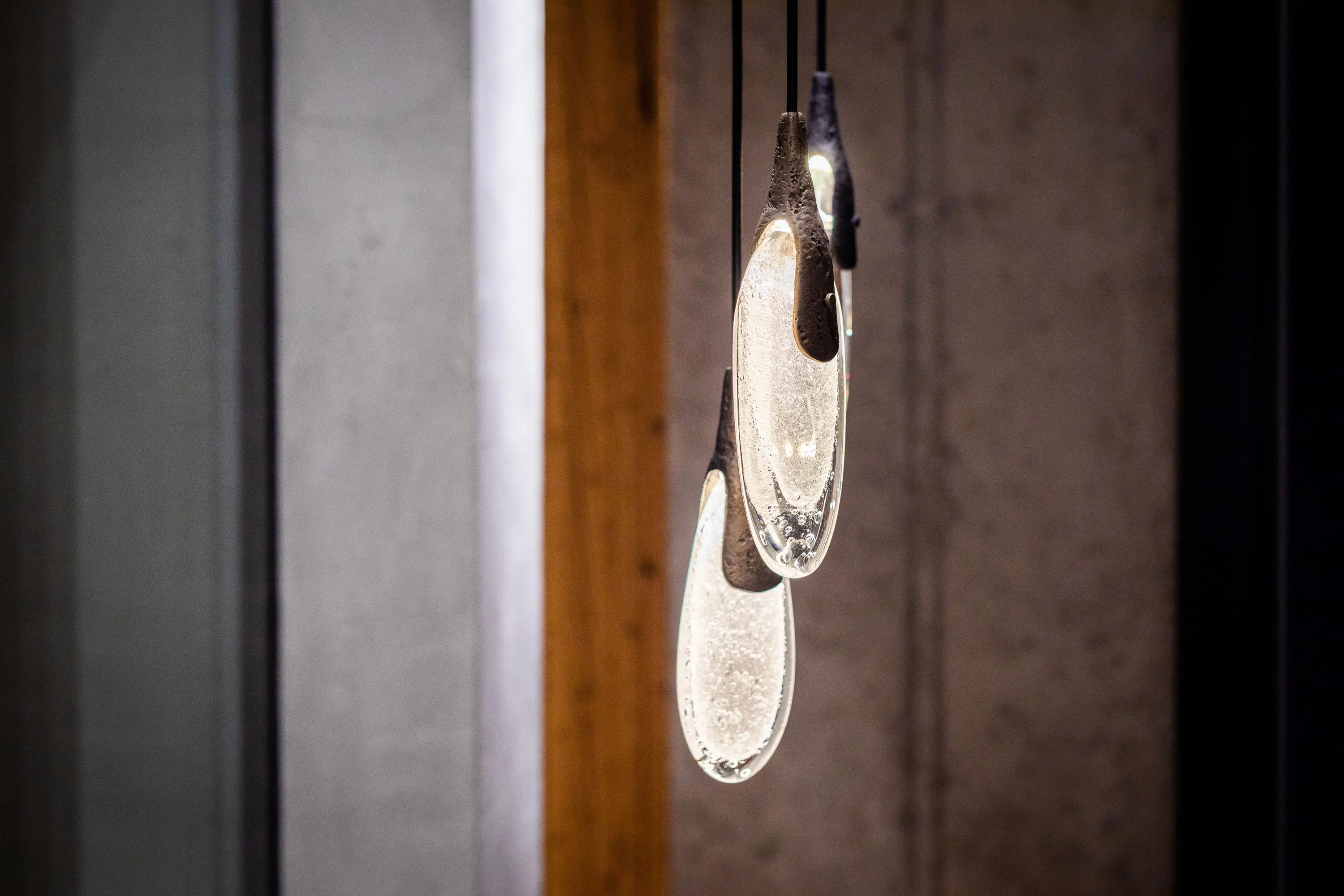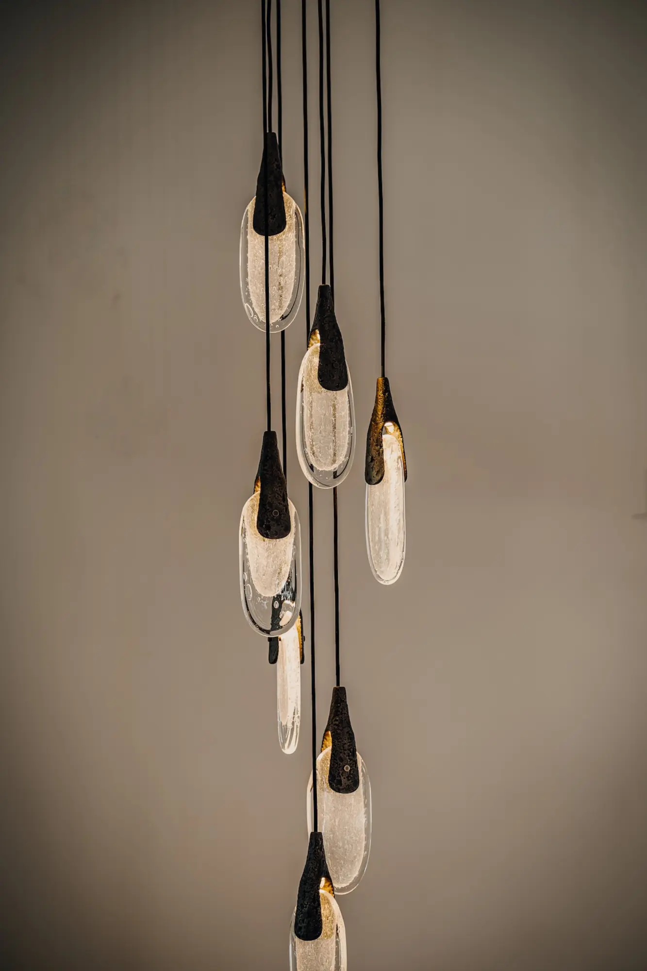 Just as eternity is immeasurable, the individual segments of Eternity luminaires are uncountable. But together they form an inseparable whole – a force that breathes life and is constantly in motion. From a seed, a tree sprouts, whose fruits give birth to seeds again. An endless cycle of life descends to us on Earth to remain here forever. The installation is made up of unique components composed of two contrasting elements: textured brass casting, which is created by hand-casting in sand, and hand-formed crystal glass (clear or sparkling).