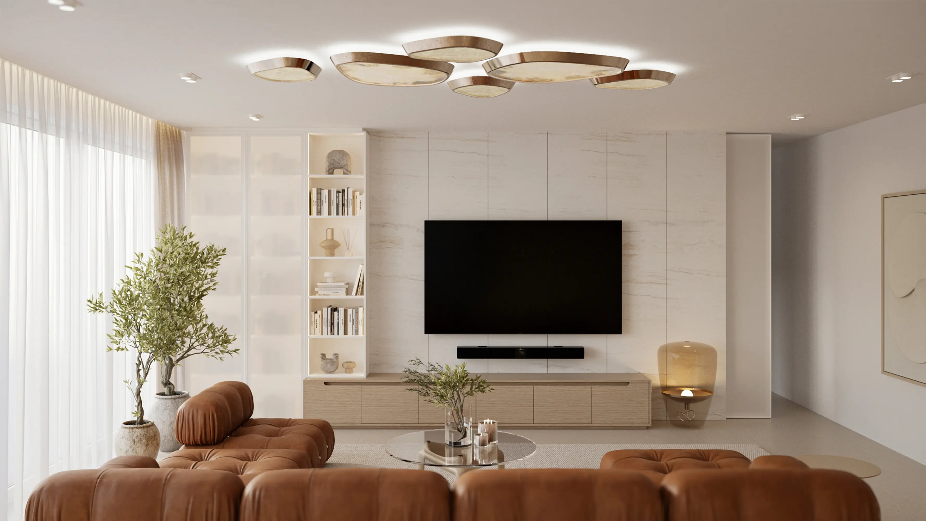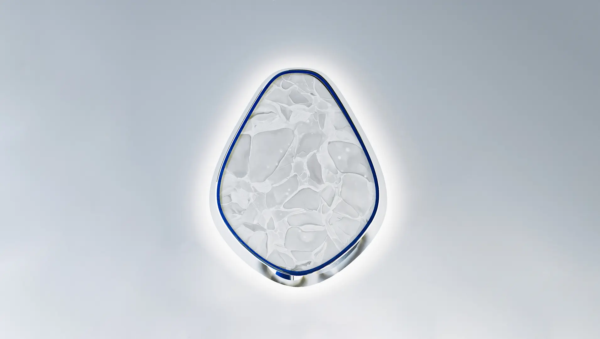 Ishi is a surface-mounted luminaire inspired by the shape of a river stone. The bottom diffuser is made of Brokisglass – a glass material produced from shards. The top diffuser is made of recycled Minus plastic from PlasticGuys. A metal frame holds everything together and ensures stability. Ishi is a manifesto of sustainable luxury. Its main strength lies in the ability to arrange individual pieces into endless compositions, similar to river stones forming a natural whole. The luminaire will be produced in two sizes, and the same metal frame will also be used to create a collection of mirrors.