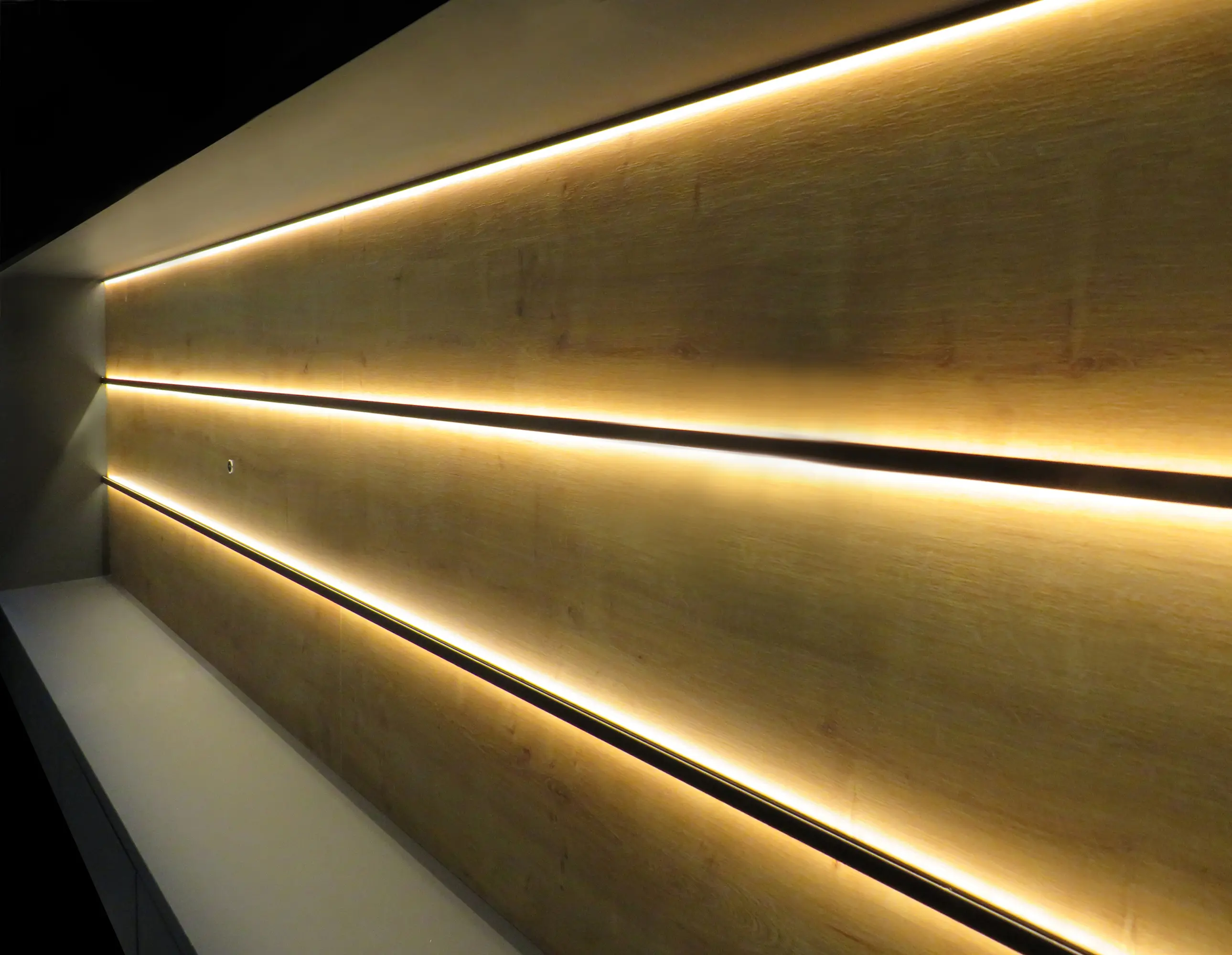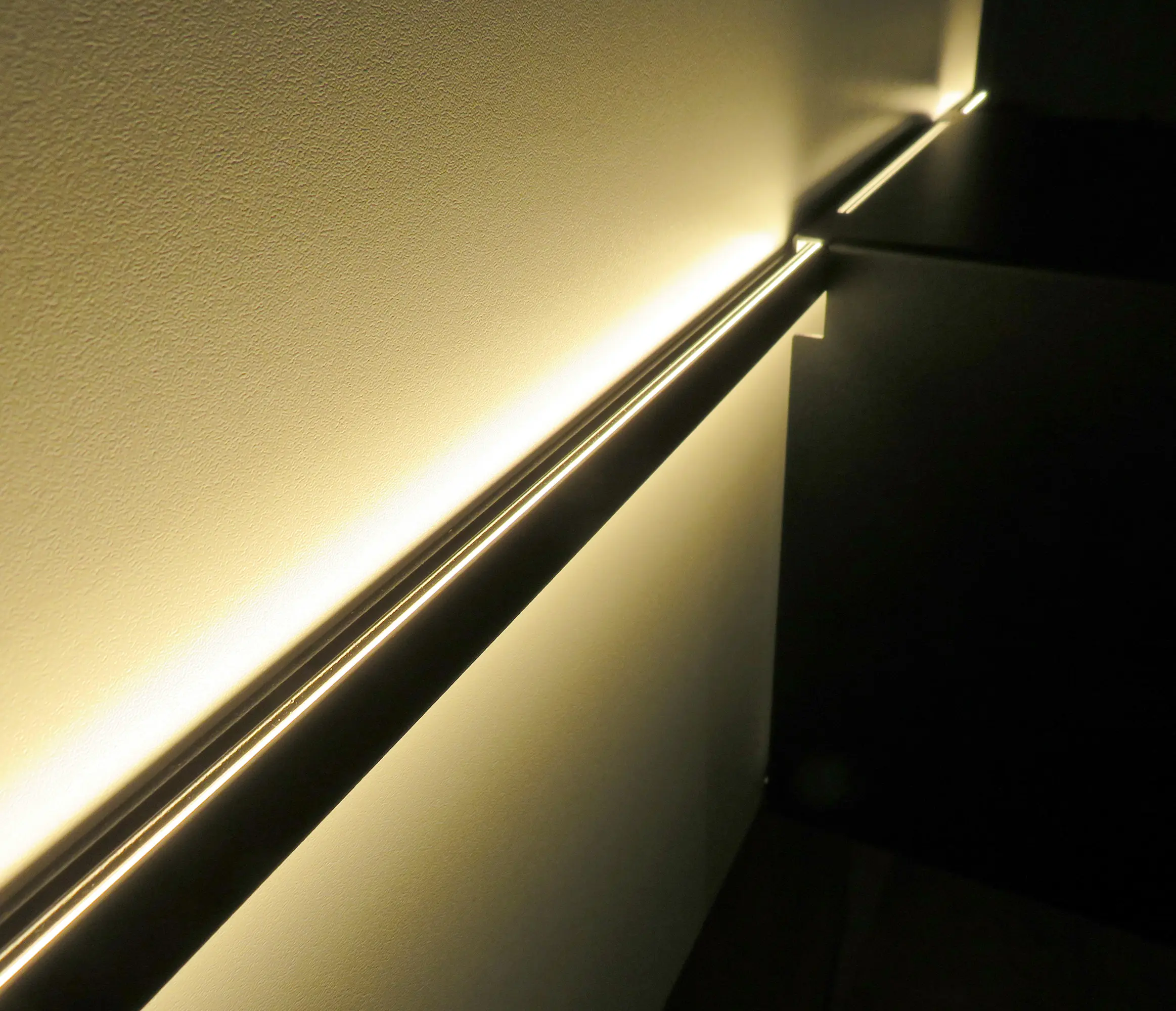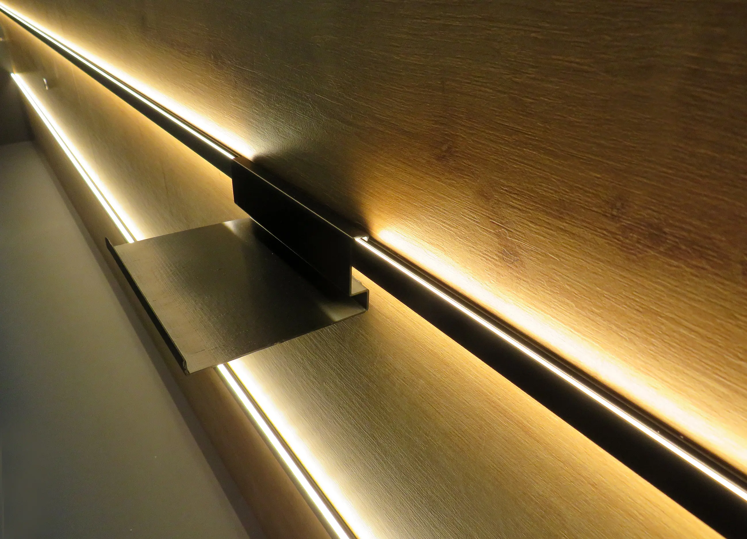 The design concept fits in visually with all standard furniture grids. At the same time, a strip of small, closely spaced LEDs provides homogeneous, indirect and glare-free lighting. Different versions create an atmospheric ambience that radiates light either upwards, downwards or to the rear. The special feature of this extremely filigree lighting system is that the customer can easily add additional elements such as shelves or holders. The focus of this new product is on simple installation, which keeps customers’ installation costs low.