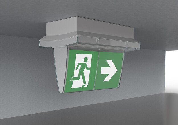 Plastic LED escape sign luminaire with trapezoidal tapered dome for ceiling or flag mounting. The version for wall mounting is fitted with a convex hood. To make installation easier, levelling screws are integrated to compensate for uneven surfaces. Planning reliability is ensured by the tool-free, variable use of the pictograms on site. The pictograms are internal and are inserted solvent-free. Thanks to the use of a seal, the luminaire meets the high splash water protection IP65.