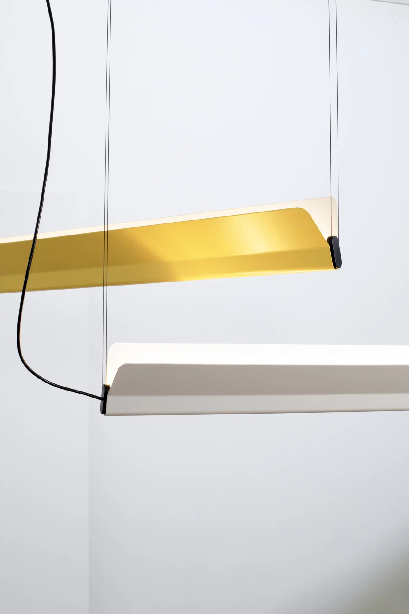Suspended in two filigree loops, SALTO can be rotated 360° around its own axis with just one movement. Its light-guiding and at the same time expansive shade becomes a balancing artist through the play of balance. SALTO can be used to create a variety of lighting situations. Each rotational position creates another lighting mood that allows us to use space in a new and playful way. Each SALTO is equipped with dimmable LED technology, which is characterised by particularly slim, glassy light lines. The light source and other components of the luminaire are replaceable.