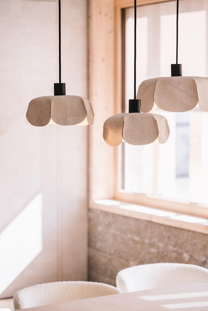 The ‘Shining Bloom’ cork lamp impresses with its minimalist design, which captures the delicate beauty of the dahlia in a sustainable and vegan choice of material. Its flexible use as a pendant or floor lamp makes it a versatile element in modern living spaces.