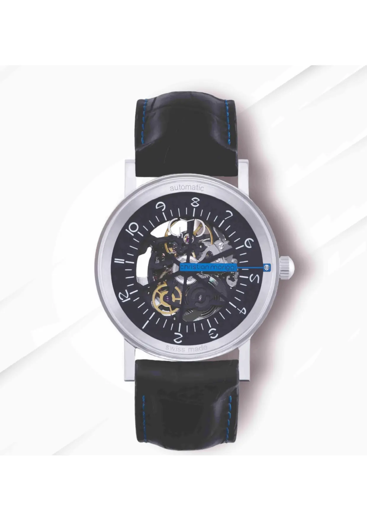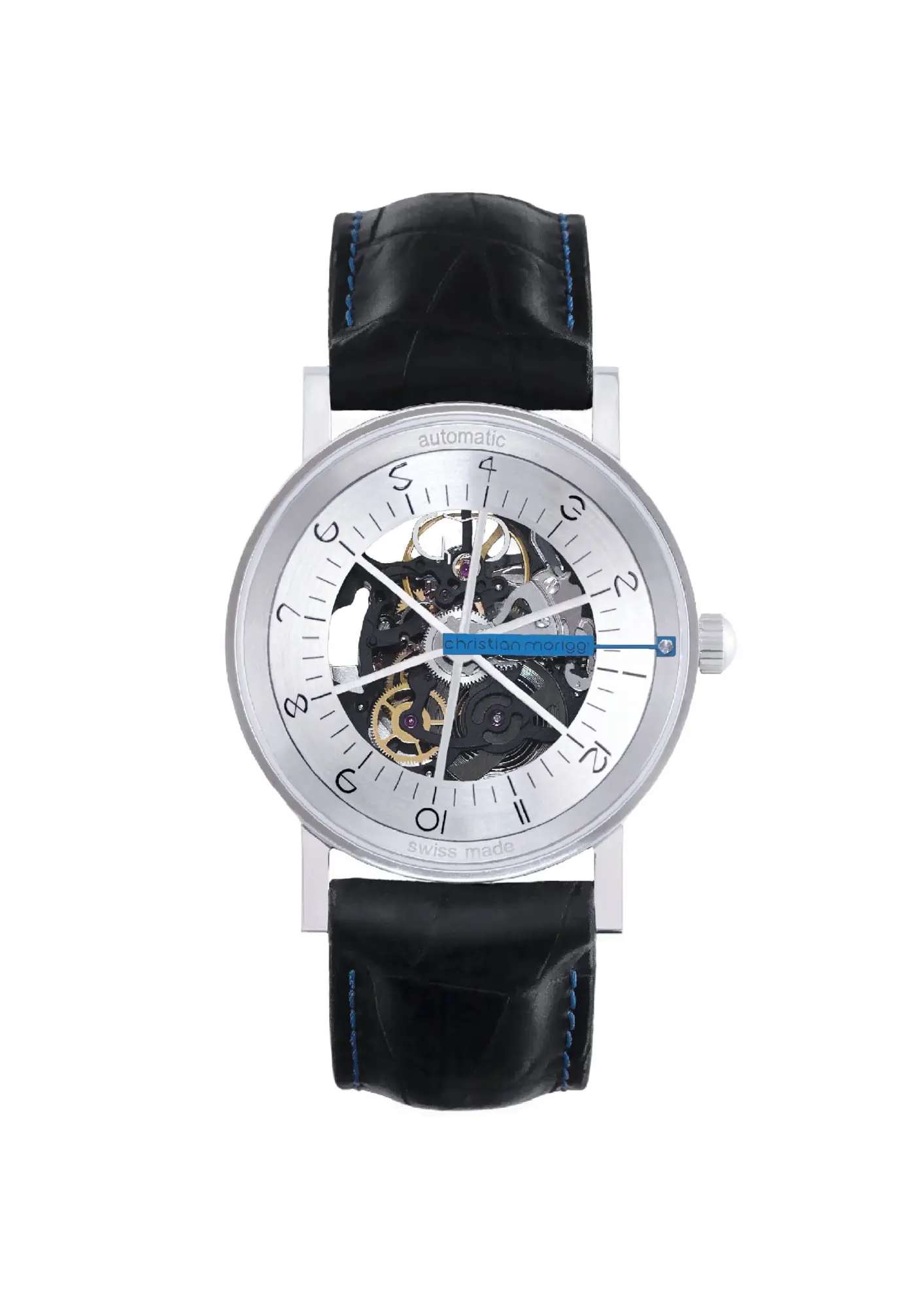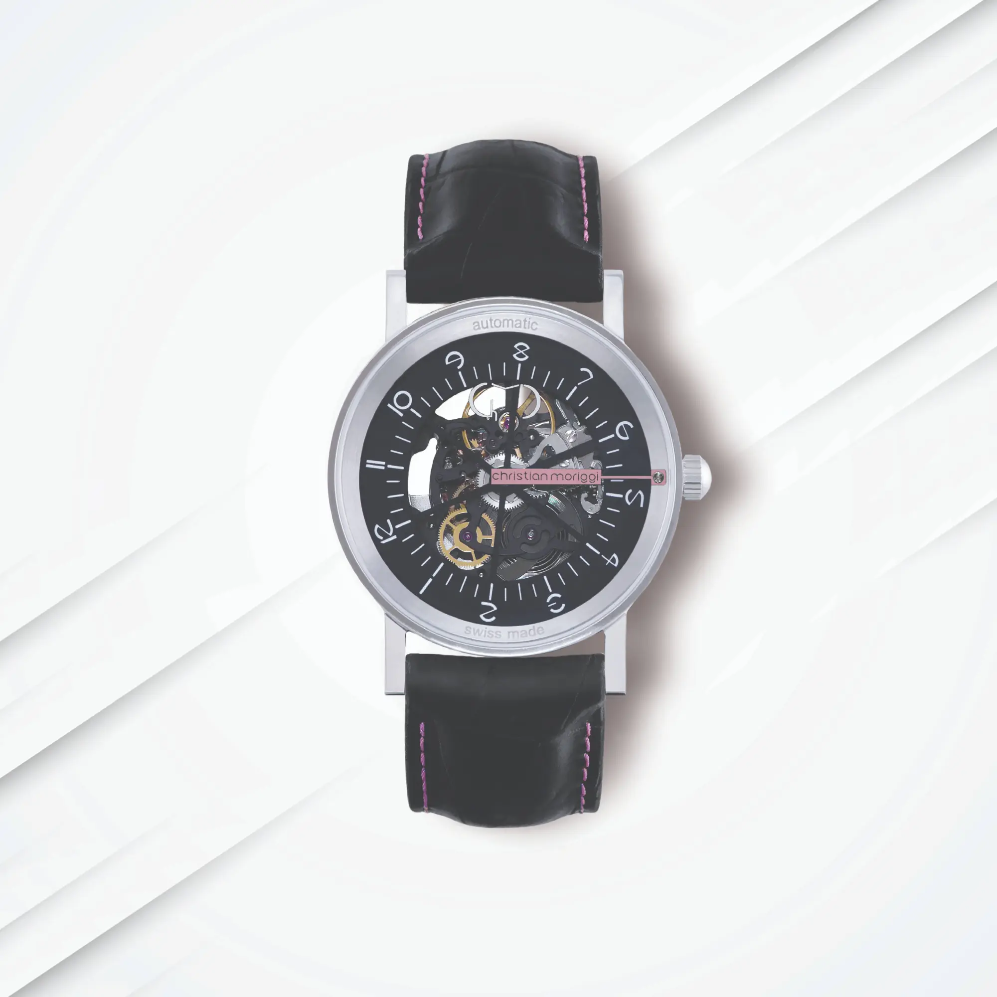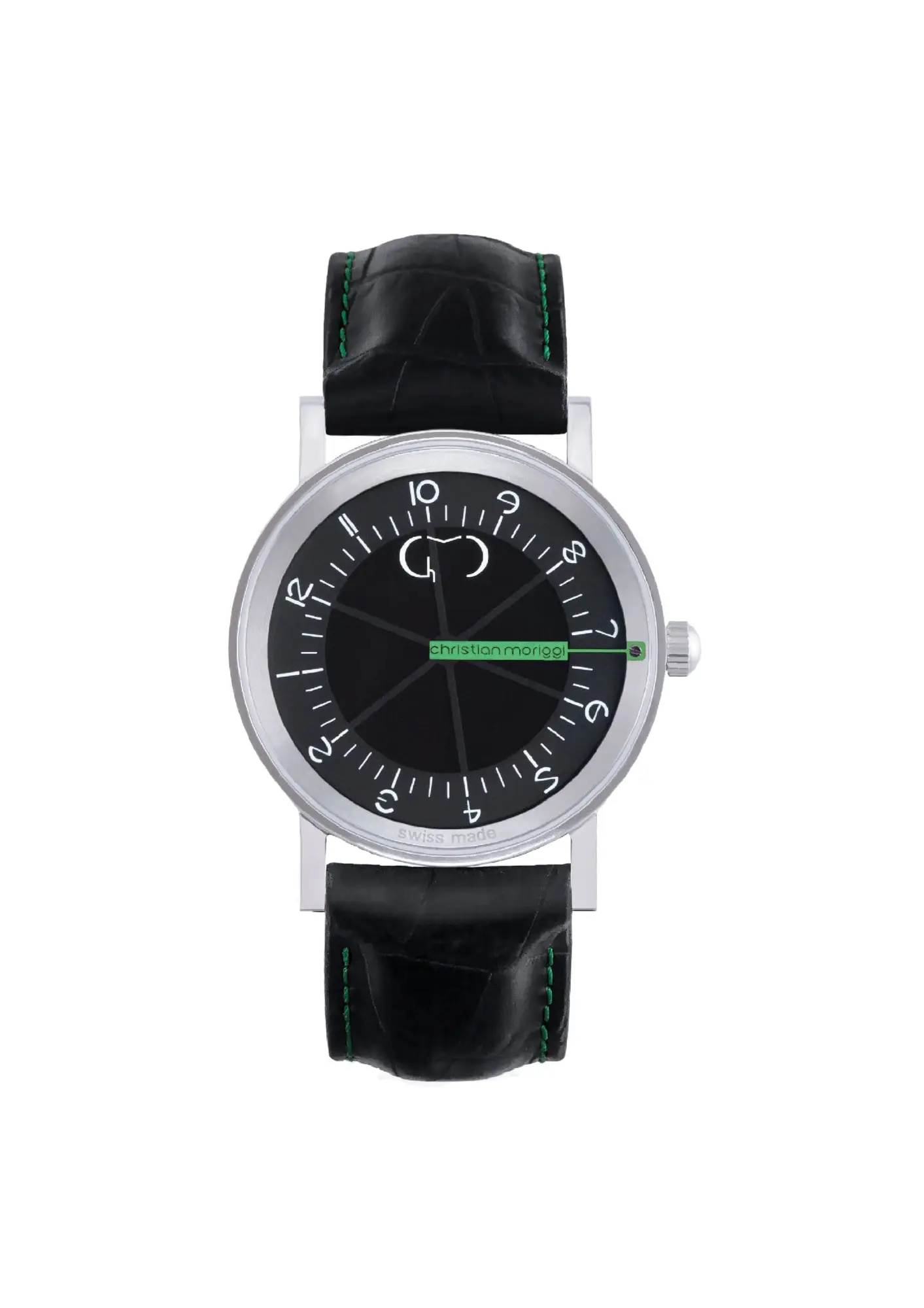 The "Christian Moriggi" watch is much more than a simple timepiece: it is a profound reflection on the perception of time and a bold reinvention of traditional watchmaking codes. Featuring a fixed hand, this watch deliberately breaks away from conventions to offer a radically new approach to how we read and experience time. The idea behind this unique design is rooted in a deep philosophy: time is not merely a linear flow to be measured but rather a mosaic of moments to be savoured. By immobilizing a hand, the "Christian Moriggi" watch invites its wearers to rethink their relationship with time and focus on the present moment.