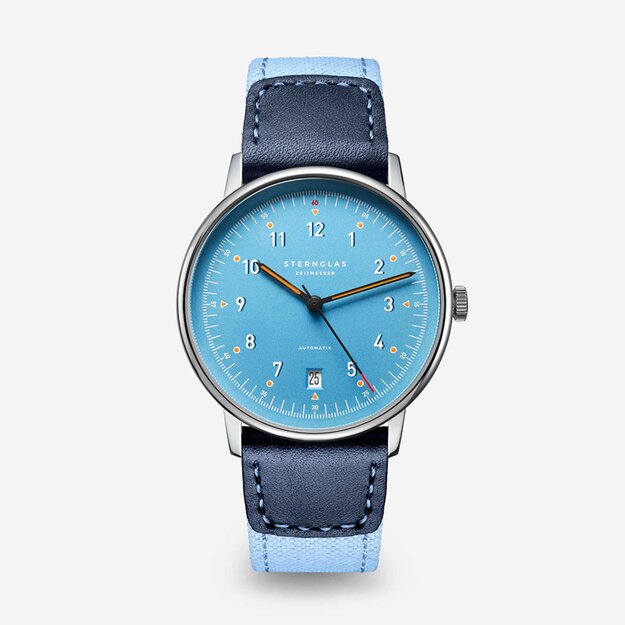 The Lumatik Automatic is STERNGLAS' first timepiece featuring dual-tone Luminova, enhancing visibility in low-light conditions. Its satined blue dial with white numerals and orange accents exudes a sporty, summery vibe. The 38mm stainless steel case houses the Miyota 8315 automatic movement, offering a 60-hour power reserve and a skeletonized rotor for enhanced performance. Blue screws add a touch of elegance. The durable light blue nylon strap complements the dial, making it perfect for everyday wear and sporty activities.