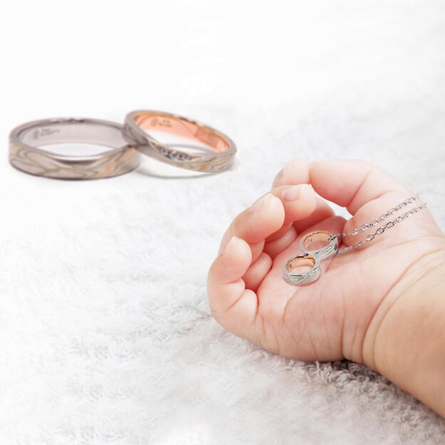 A family-bonding pendant, engraved with their baby's birthday, can be split into two pendants later by the parent and child. Its design mirrors the connected state of the parents' wedding ring, which symbolizes their bond formed by splitting one ring into two. This jewellery, offering children a similar experience, becomes a symbol of the family's deep connection.