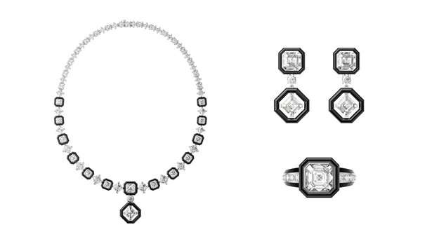The Art Deco removable set collection features striking black & white contrasts with metal and enamel interplay. Designed with geometric forms and enhanced through polishing, electroplating, and enameling, it combines 18K white gold and 3D enamel for a luxurious yet modern look. The versatile earrings and necklace can be worn separately or mixed with other jewelry. The ergonomic design ensures comfort, with the ring featuring a smooth, beveled band. Utilizing advanced enamel firing technology and eco-friendly materials such as lab-grown diamonds and recycled gold, the set offers high quality at a reduced cost while promoting sustainability.