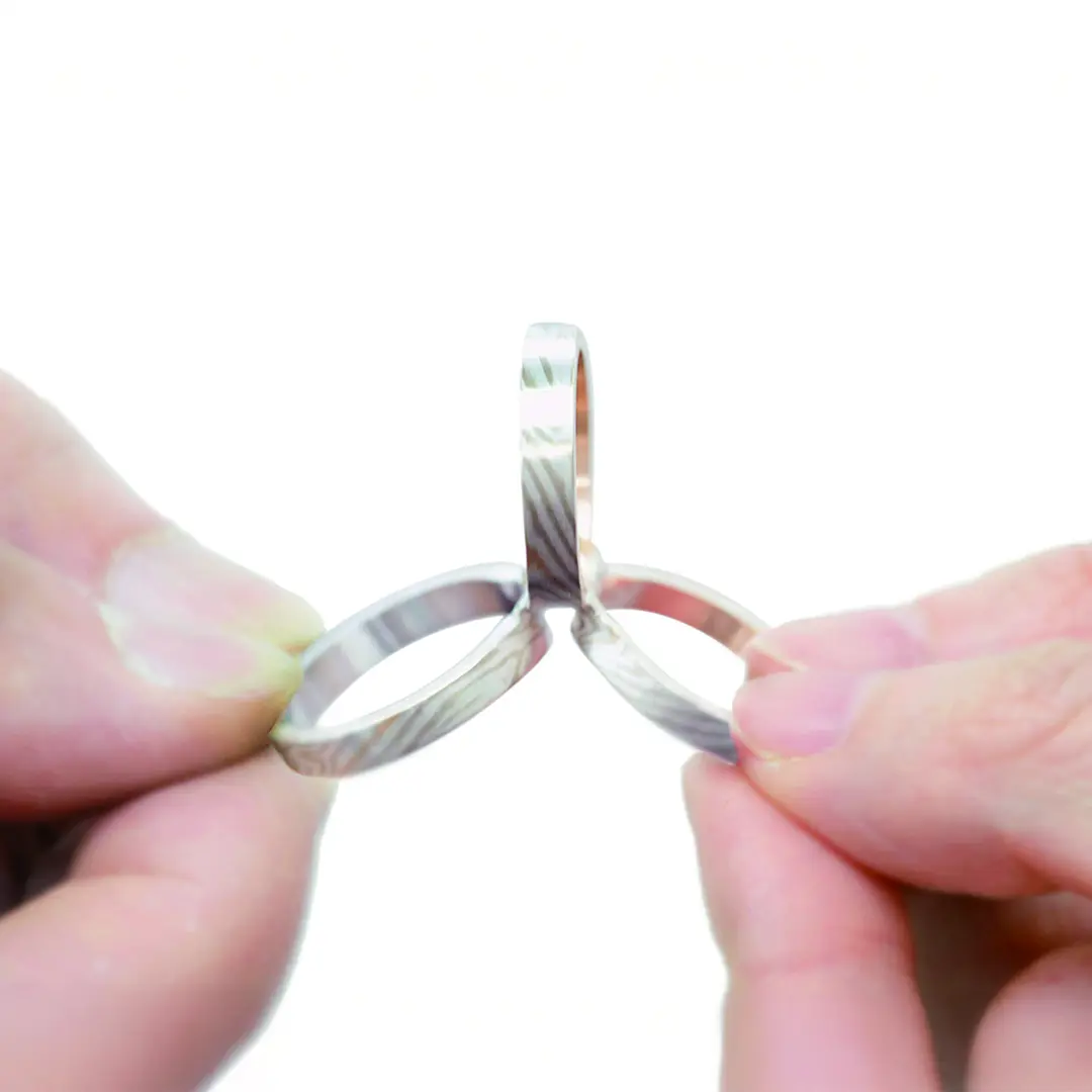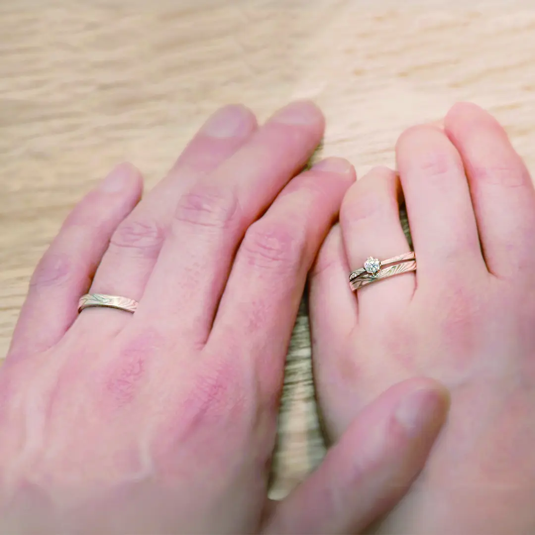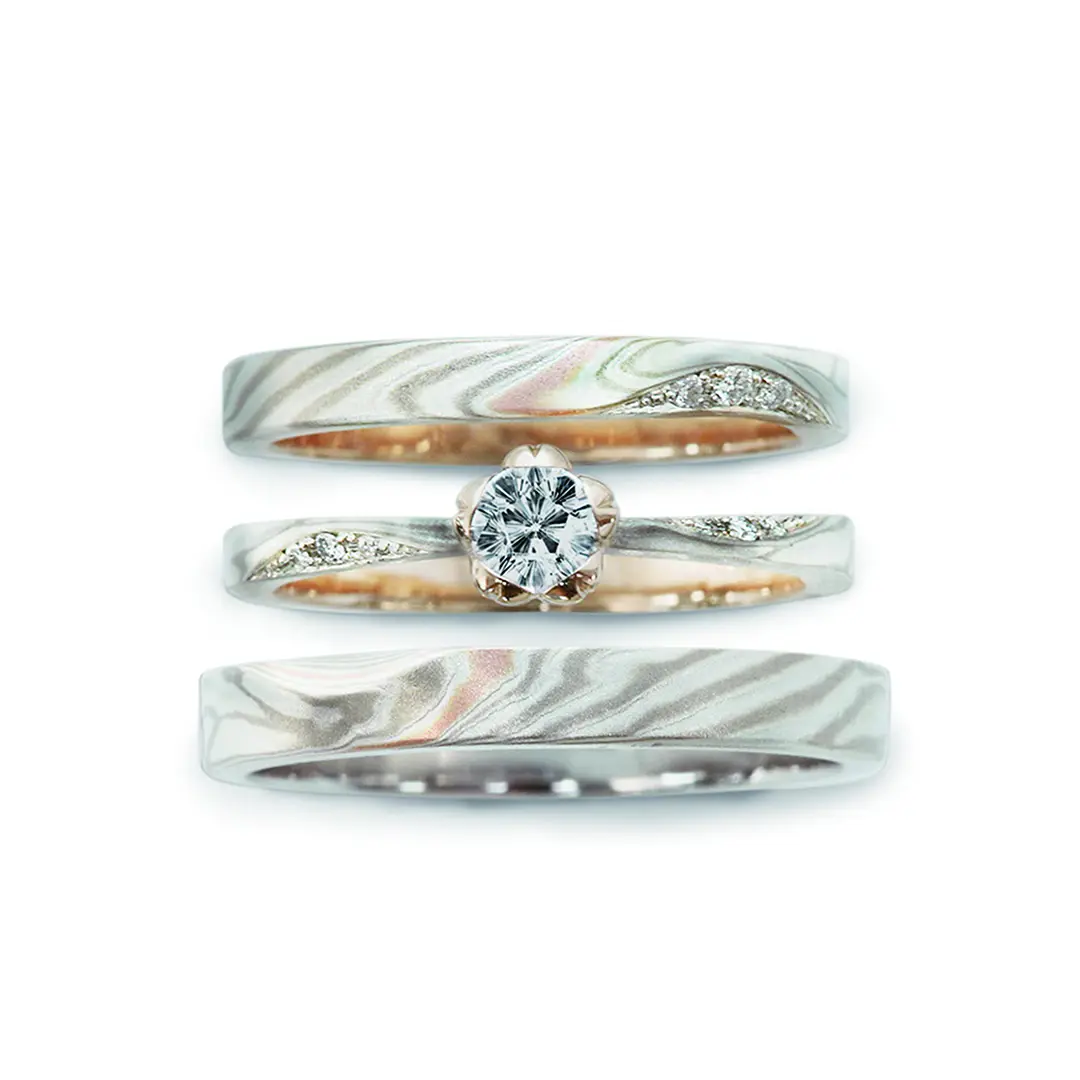 One ring is completed by the two people getting married themselves, sharing it between the wedding and engagement rings. They can participate in the creation of their own rings. The three rings leave 'traces' as proof of their connection, which become part of the design of the rings, and these 'traces' always remind the couple of the moment they shared the rings and strengthen the bond between them. Unlike wedding and engagement rings, which are just a form, we believe that the essential meaning of marriage is to establish a form of connection between two people as partners, and we have pursued a wedding ring design that symbolises this.