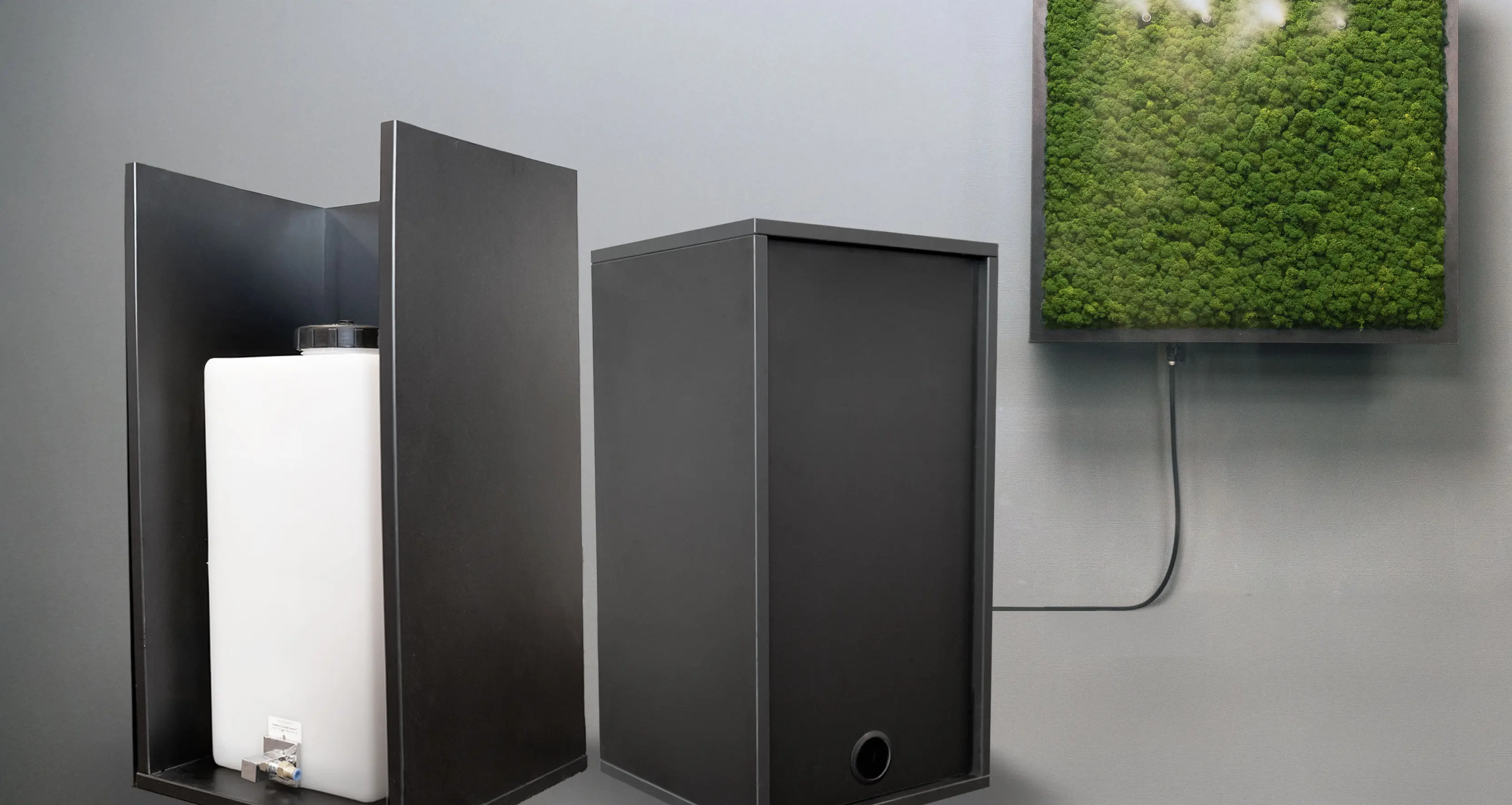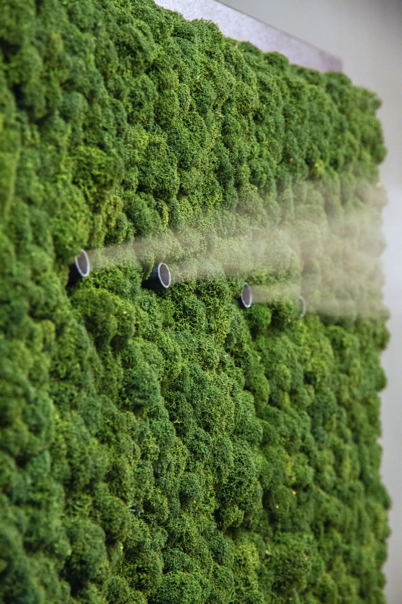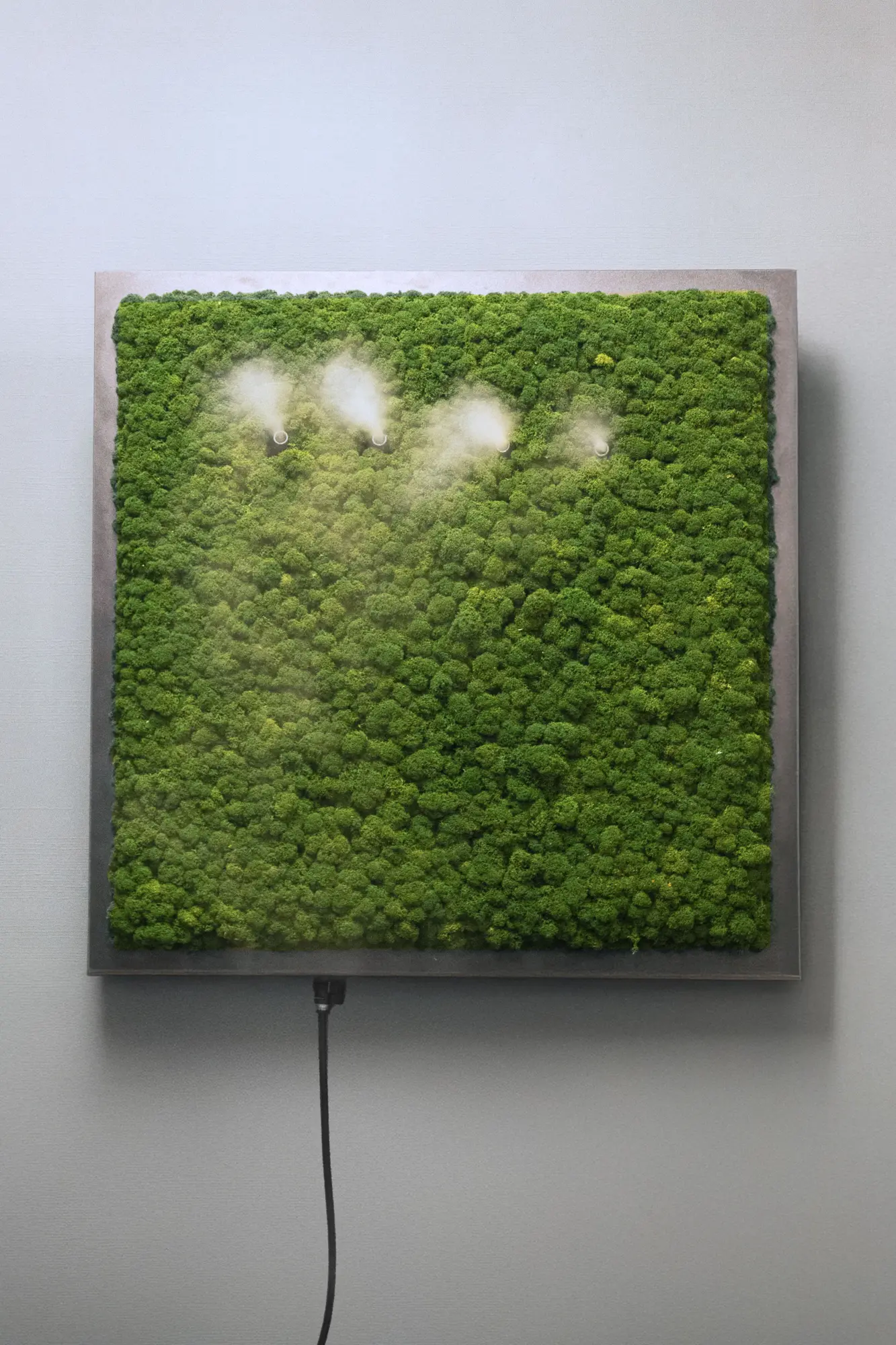 HB revolutionises indoor climate control through an innovative fusion of high-tech and living nature. This wall-integrated system combines precision membrane atomisation technology with a bioactive Icelandic moss panel that acts as a natural humidity buffer and air filter. The moss stores moisture and releases it on demand – a self-regulating cycle that remains active even when idle. Dust particles are biologically filtered. The result: forest-fresh air quality throughout the entire room. HB redefines sustainable design – an aesthetic wall installation that creates wellbeing while dissolving the boundaries between interior and nature.