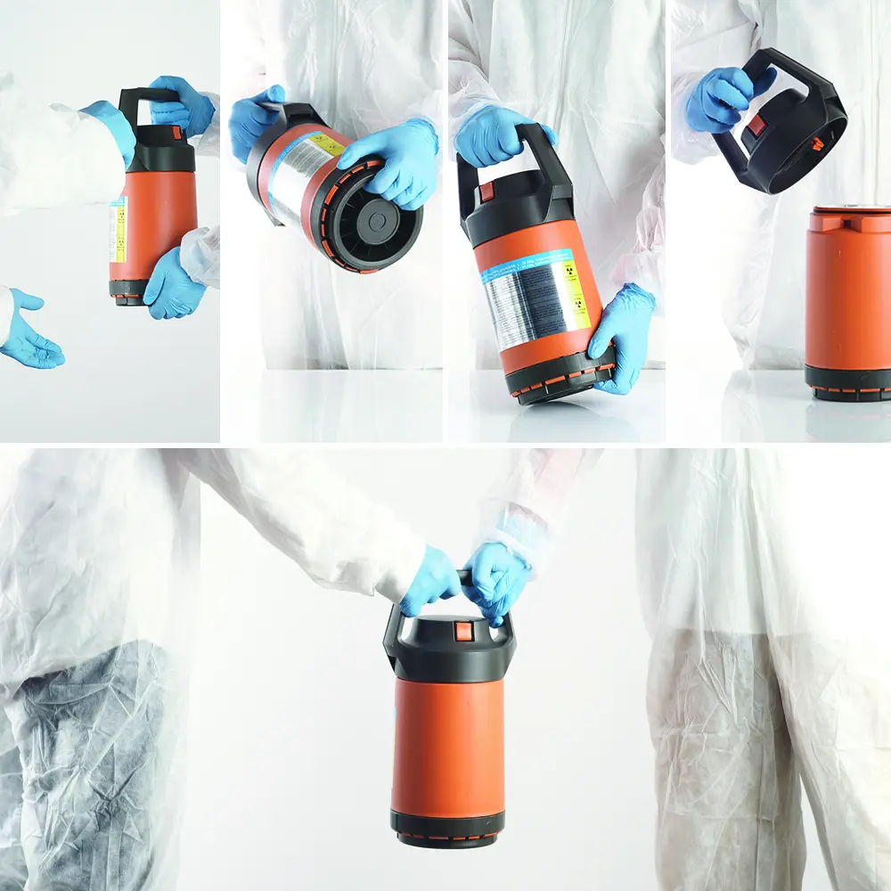 Radionuclide generators are essential for nuclear medical diagnostics, as they provide short-lived radioactive substances directly at the point of use. Despite integrated shielding, close-contact handling, such as extraction, still involves radiation exposure. Repeated exposure can lead to serious occupational illnesses and long-term health damage for radiology staff, as risk levels are determined by radiation intensity, clearance, and time. Two patented design features reduce contact, duration, and strain: a quick-locking lid for safe, fast access; and a multi-grip ergonomic handle that may increase clearance during transport and handling.