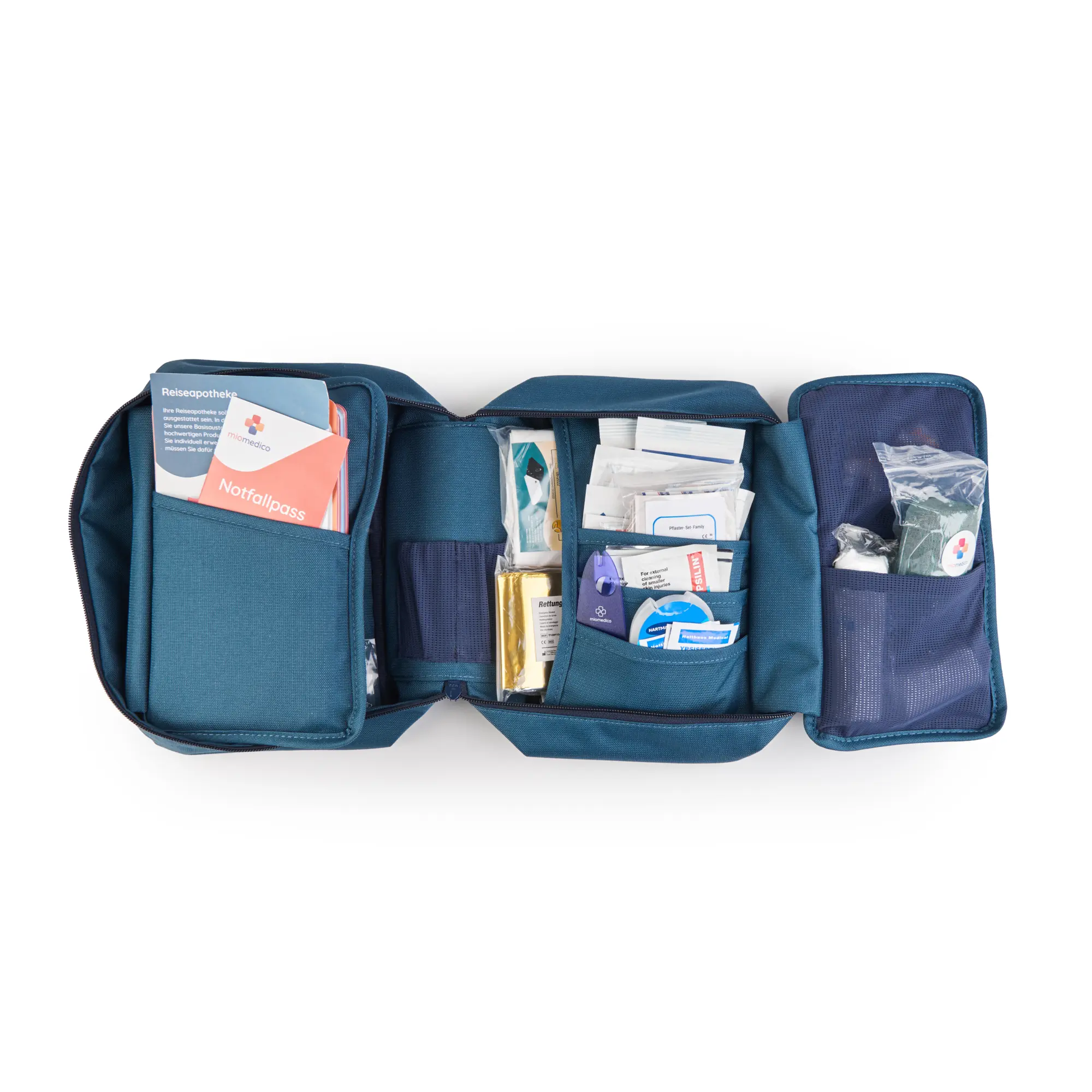 A bag whose shape and layout make it ideal as a first-aid kit. The division into compartments and small zippered pockets allows for easy organization, helping you quickly find first-aid supplies or medications when you need them. There are also special compartments for medical devices such as thermometers and tweezers. Nothing falls out when you open the bag. To ensure the best possible medical treatment, step-by-step instructions have been included as a booklet and app. This way, it's always clear when it's an emergency, what I can do myself, and when I need to see a doctor.